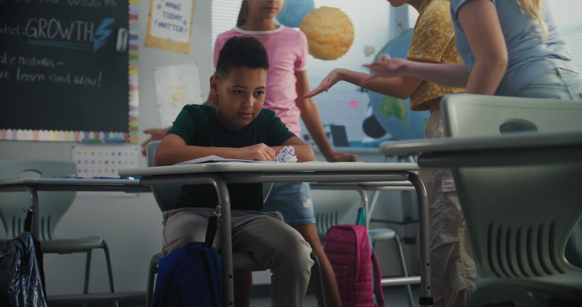 Sad African American Elementary School Student Sitting Alone At Desk And Crying While Classmates Bullying Him Laughing And Throwing PapersÂ