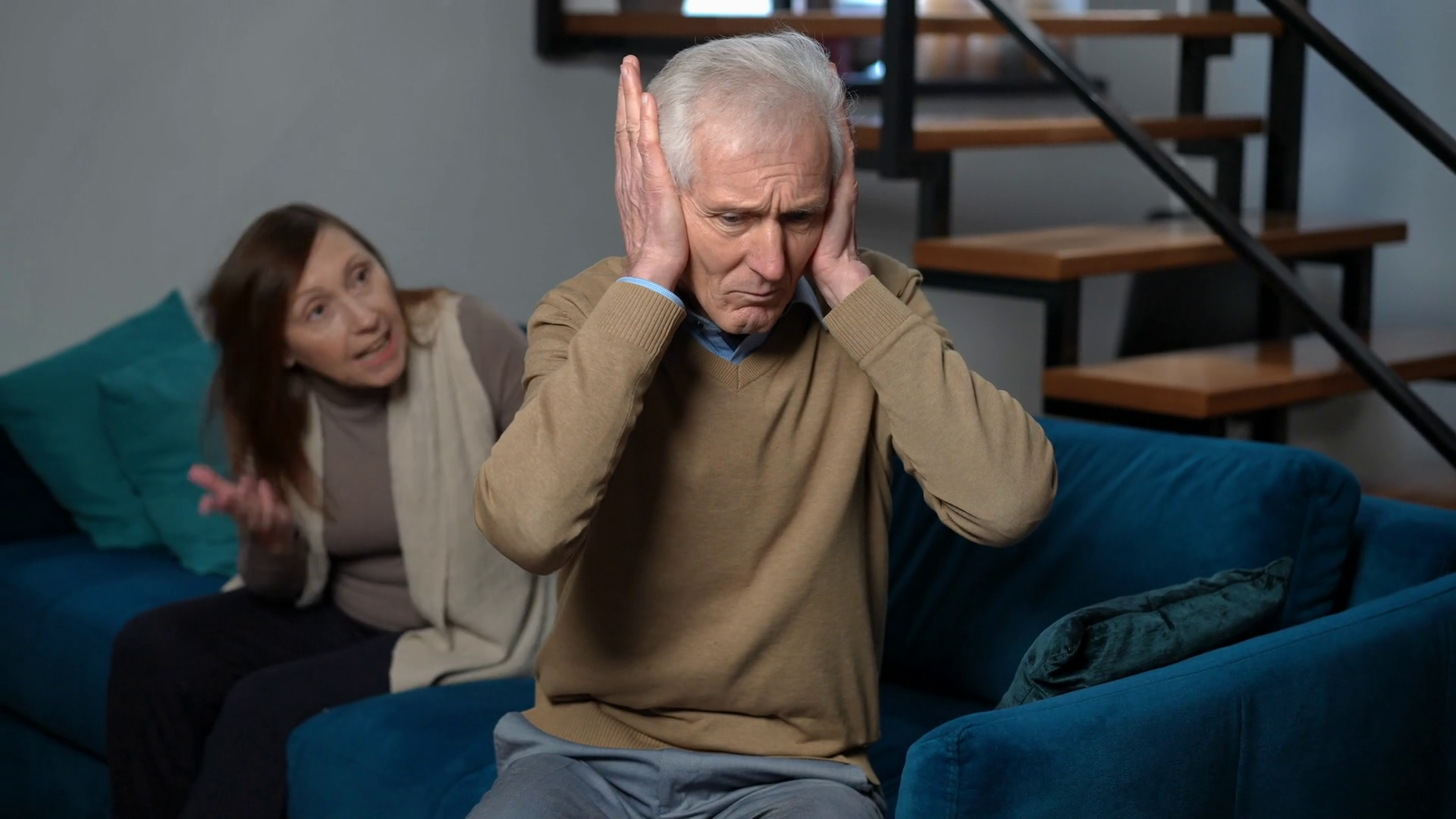 Elderly Man Covering Ears While Woman Argues In Living RoomÂ