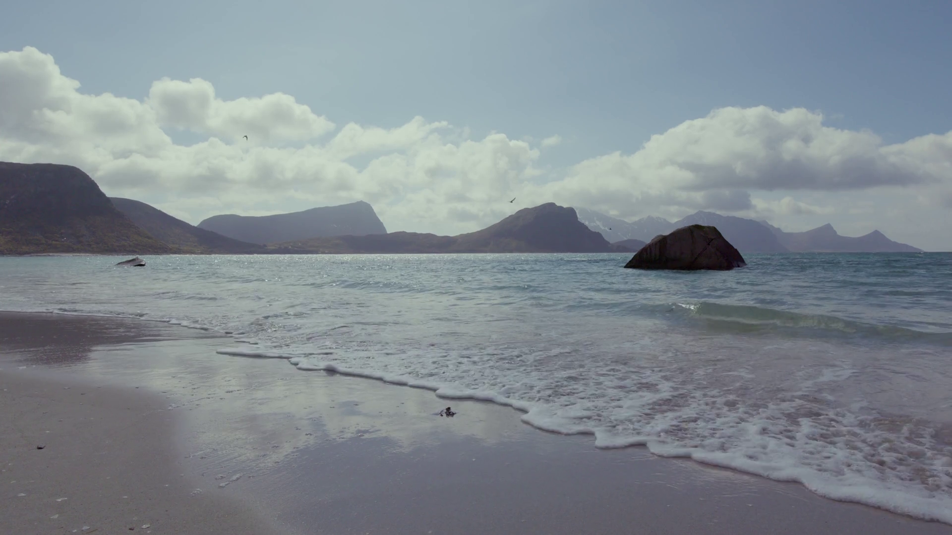 Scenic Beach With Mountainous Backdrop In Lofoten Norway Under Cloudy SkiesÂ