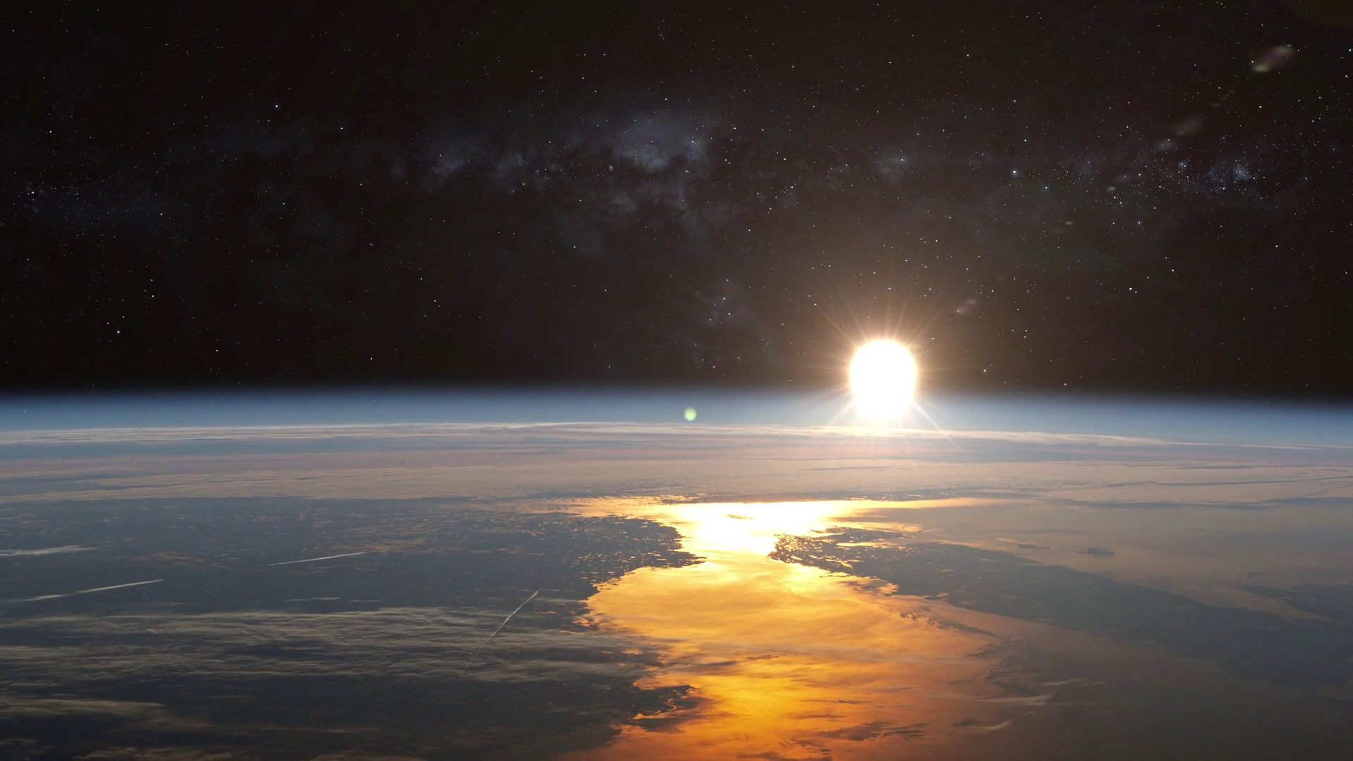 Scenic Sunrise On Earth View From Space Reflection On Ocean And Stars On Sky In Background Contains Public Domain Image By Nasa