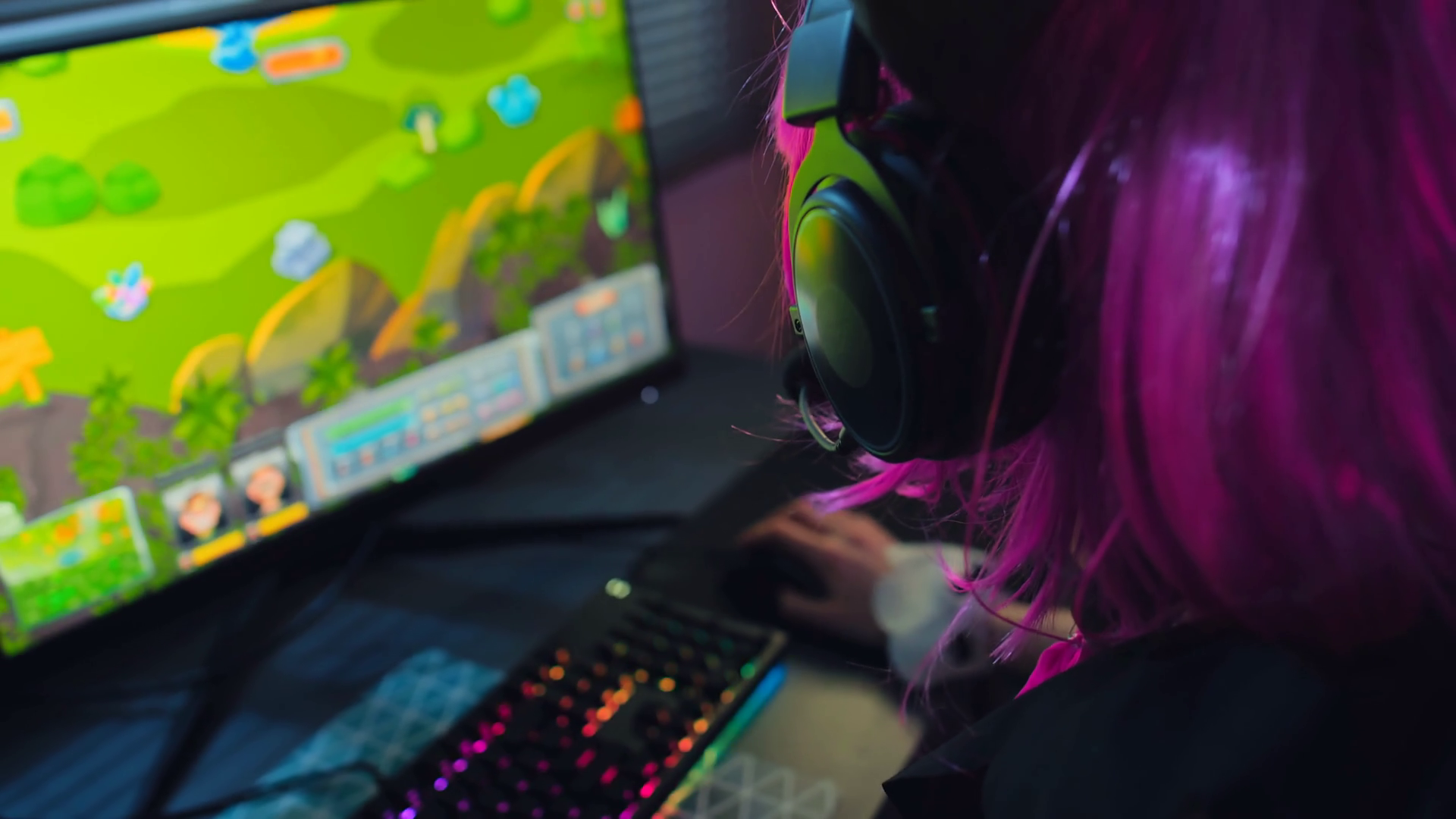 Selective Focus Shot Of Modern Teen Girl Wearing Pink Wig And Gaming Headset Playing Game On Desktop ComputerÂ
