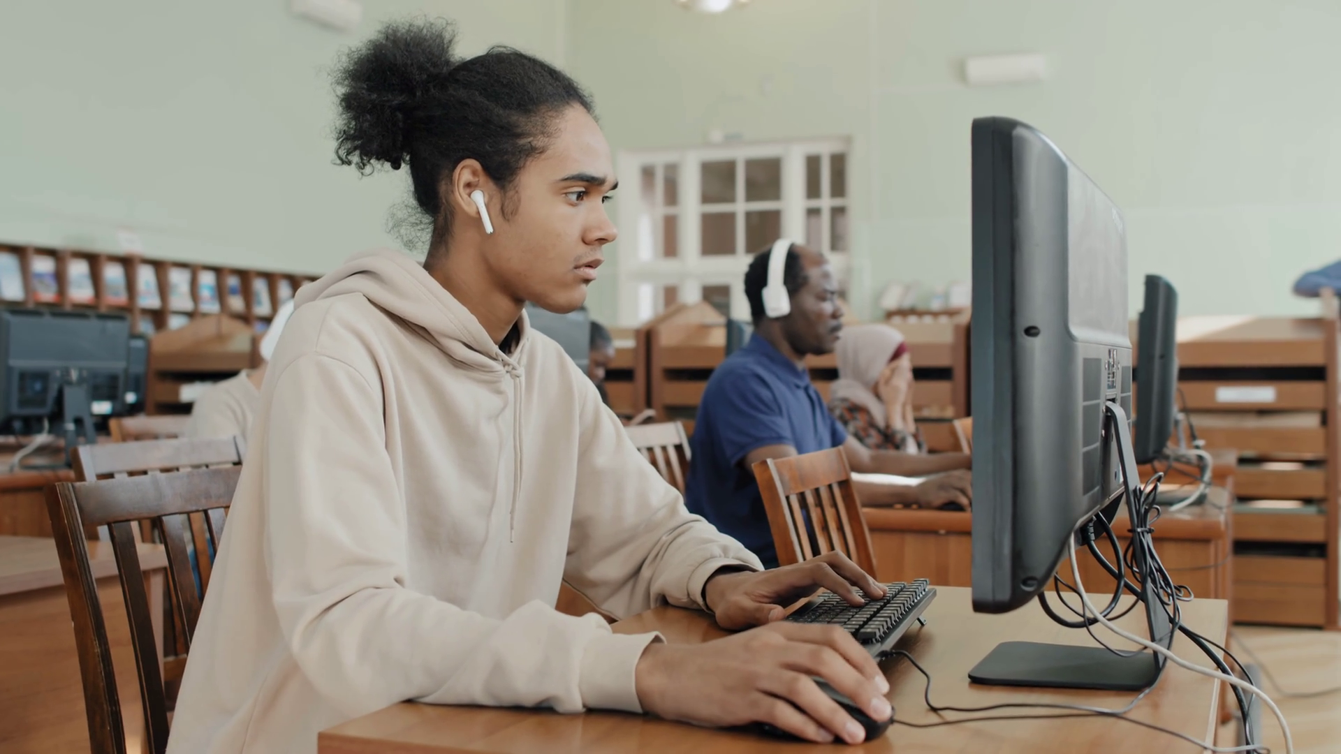 Focused Shot Of Young Student Wearing Wireless Earphones Working In College LibraryÂ