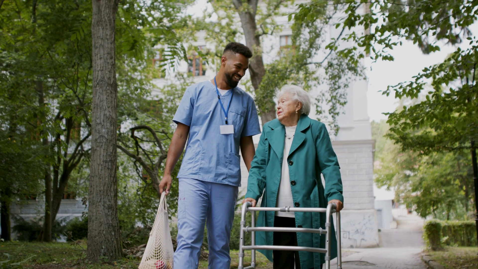 Senior Woman And Caregiver Outdoors On A Walk With Walker In Park TalkingÂ