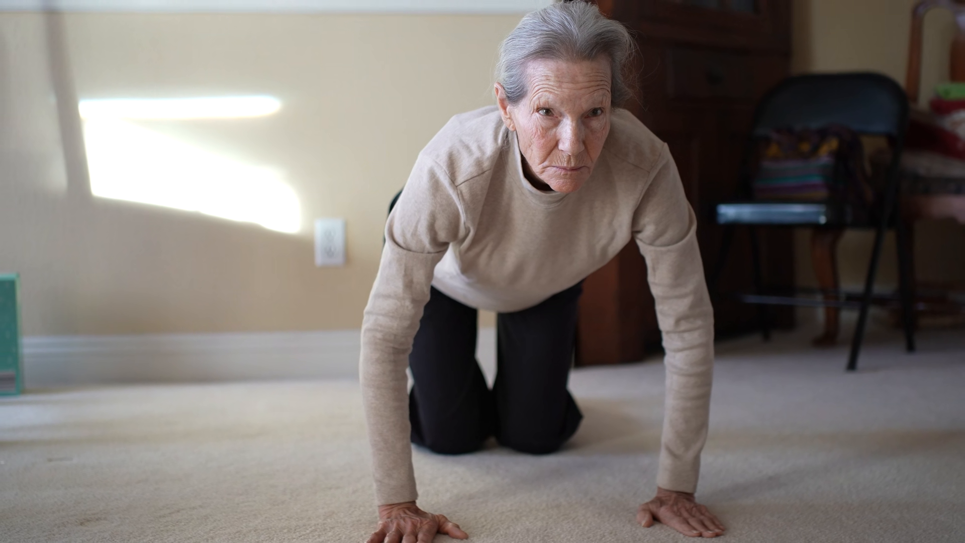 Senior Woman Does Morning Yoga Stretches And Exercises In Her Living Room Focused On Health And Fitness For SeniorsÂ