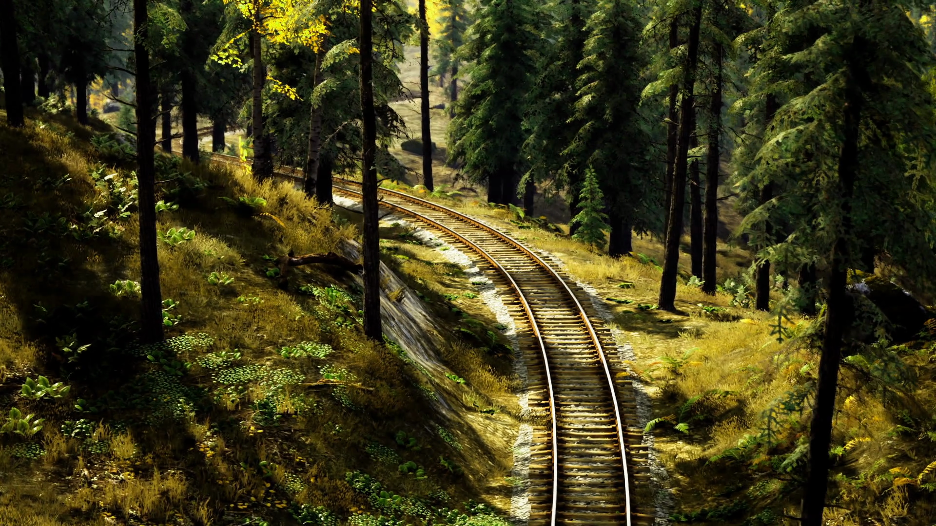 Serene Railway Curve Weaving Between Majestic Pines In Gentle Afternoon Light