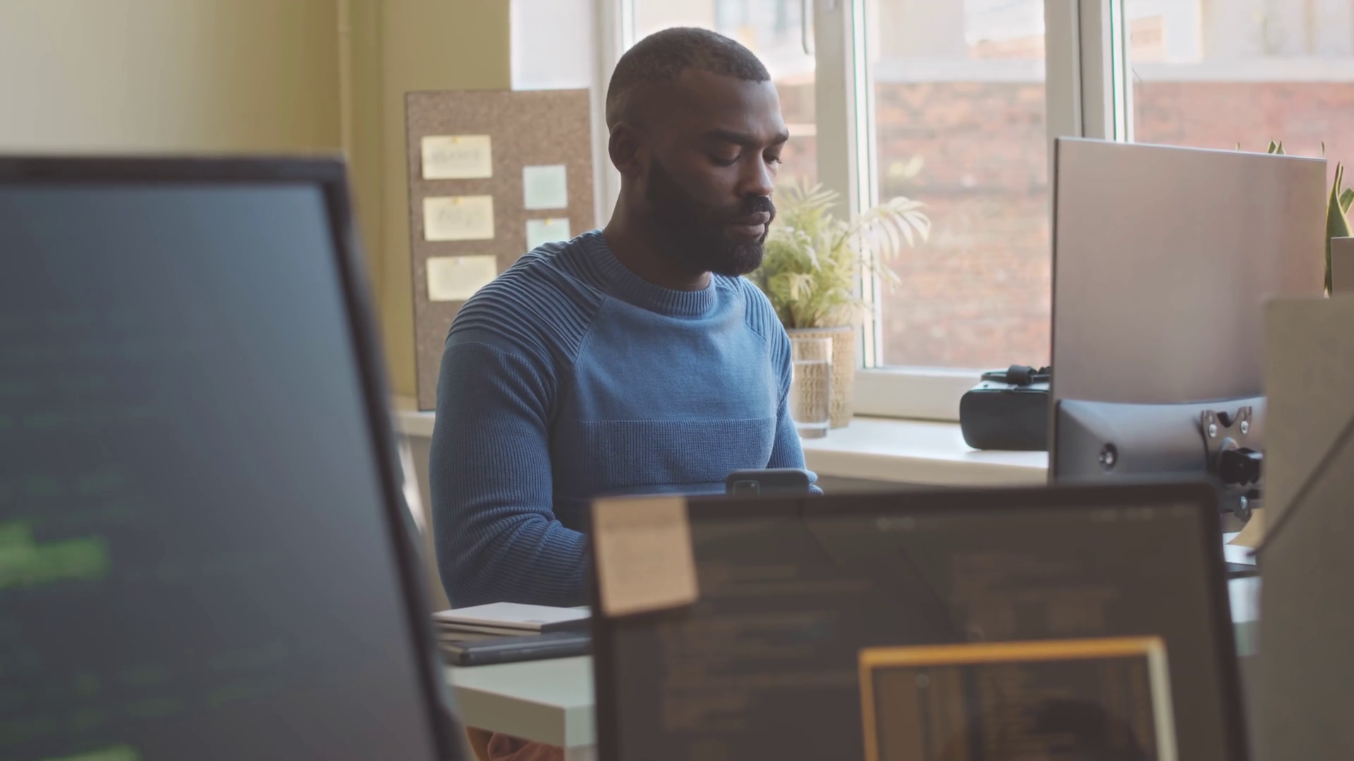 Serious African American Computer Expert Program Coding On Desktop Computer While Working In OfficeÂ