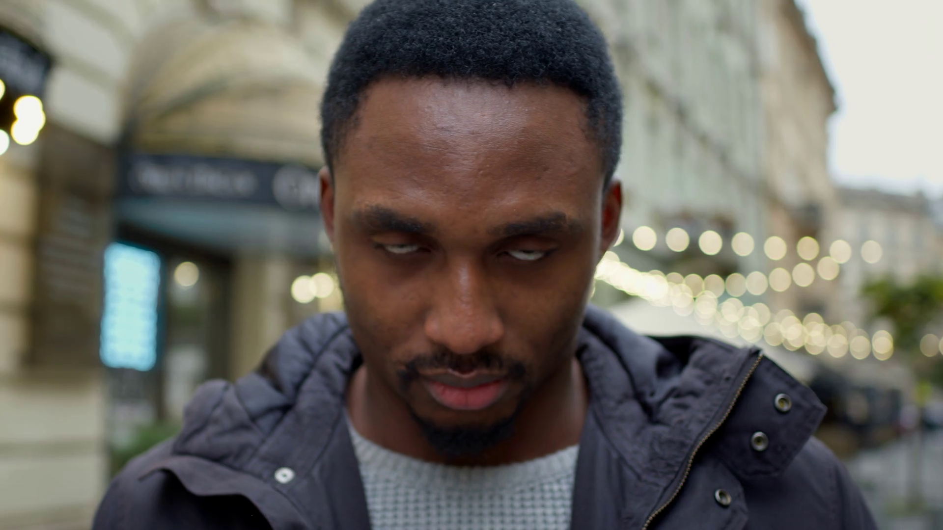 Serious Black Guy On The Street He Raises His Lowered Head Face Close UpÂ