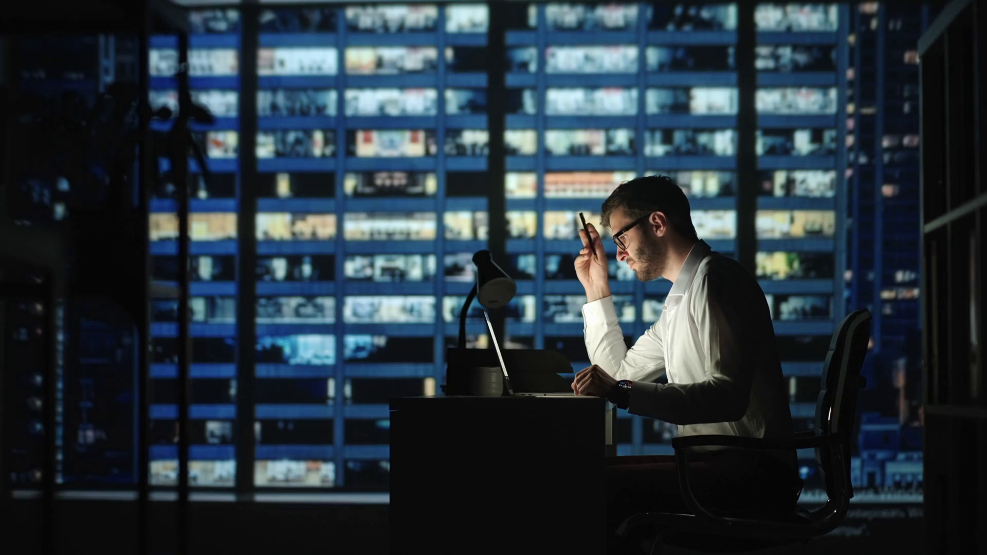 Serious Man Employee Sit At Desk Develop Start Up Ideas Search Problem Solution Working Hard Use Laptop App At Night In Modern Skyscrapers Office Room Deadline Careerism Workaholism ConceptÂ