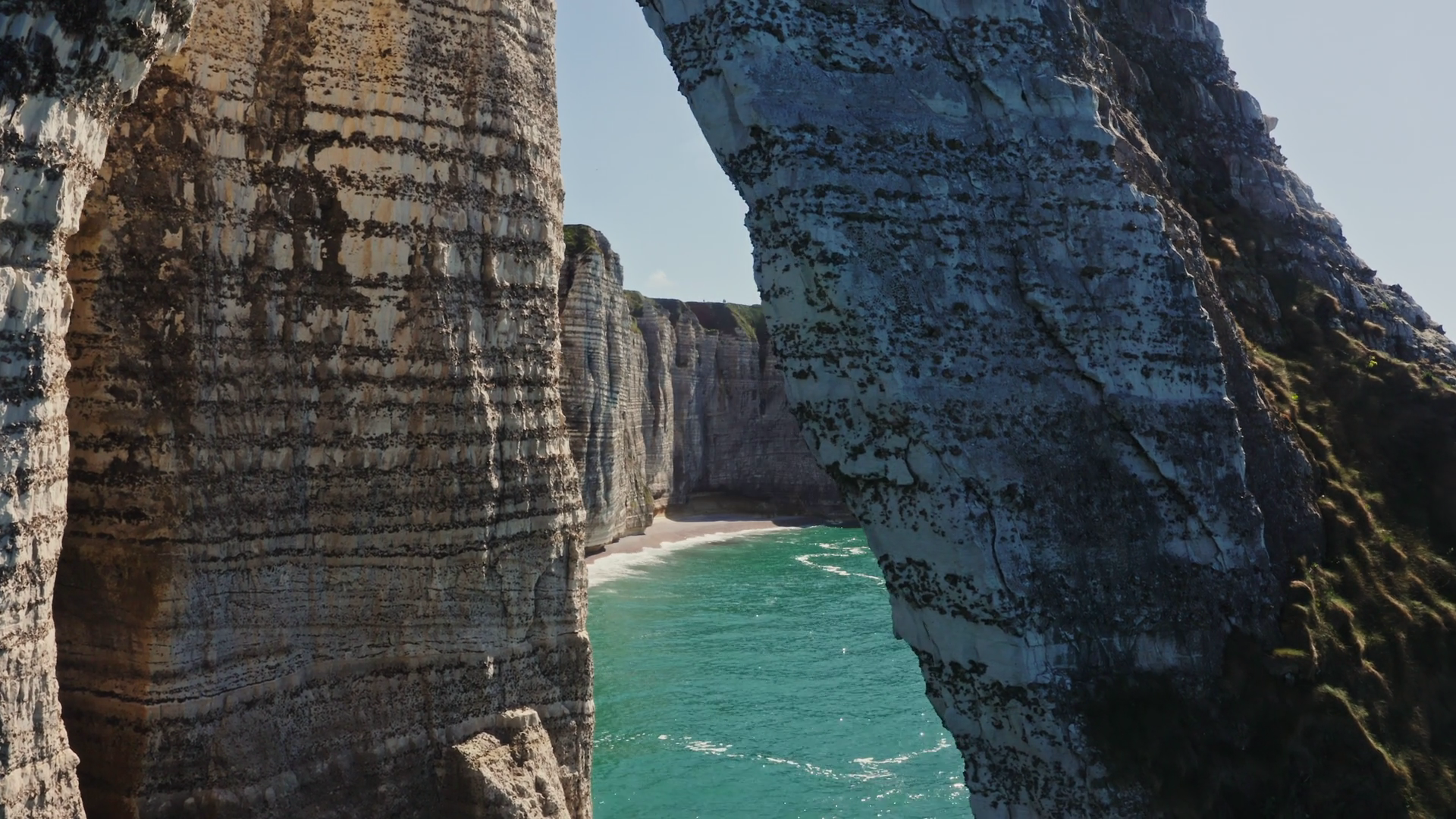 Sheer Striped Rocks Made Of Natural Limestone And Silicon Closeup Video Shooting From A Drone Through A Natural Arch To A General View Of The Rocks Etretat FranceÂ