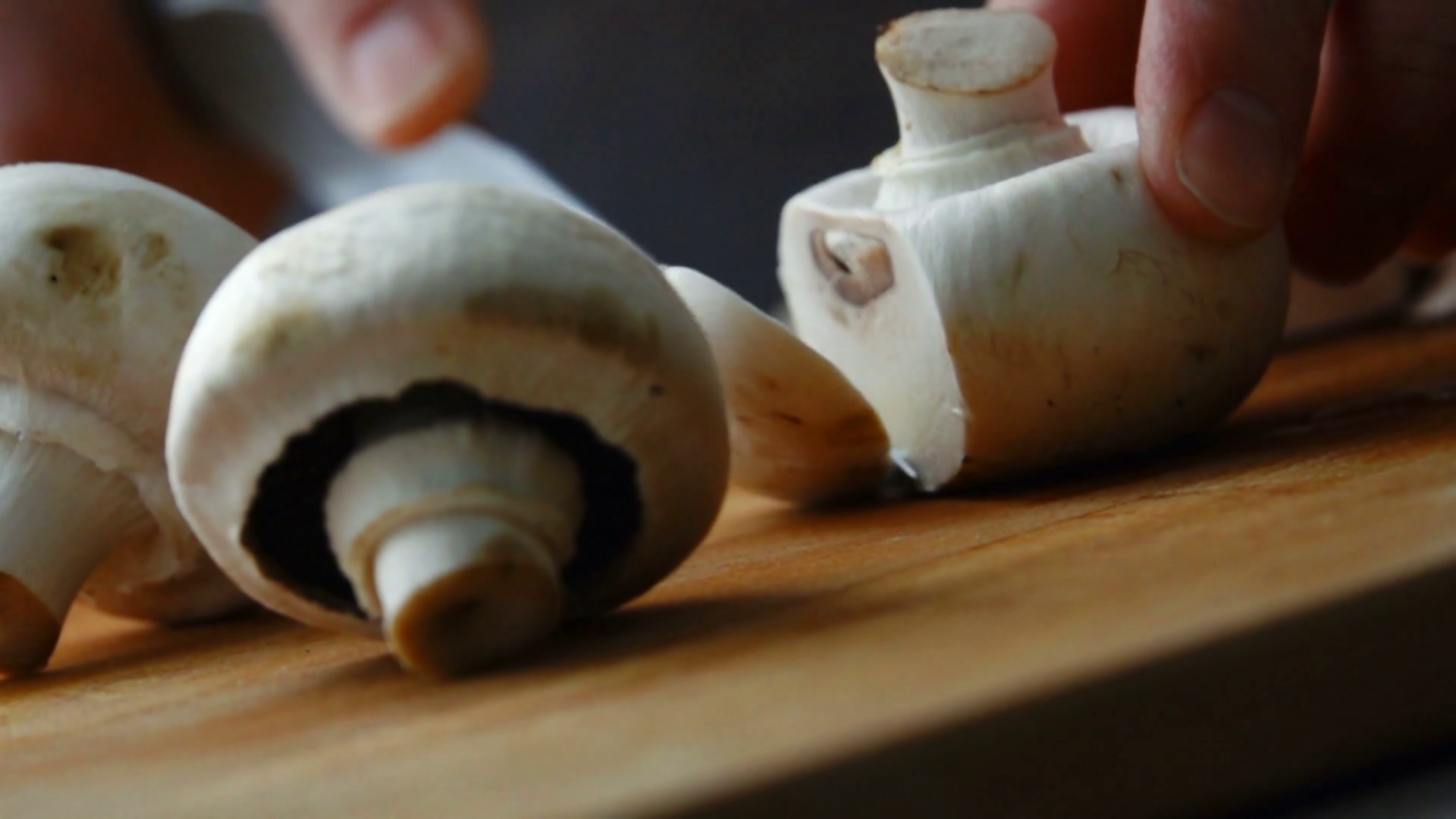 Shot Of Woman Chef Cutting Mushrooms On Chopping Wooden Board Slow Motion VideoÂ