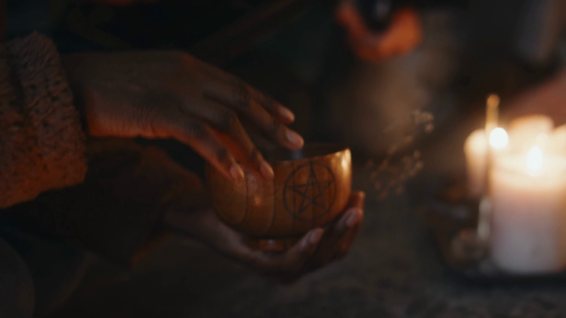 Side Tilt Closeup Of Young African American Lady Pronouncing Spell Over Wooden Cup With Sixpointed Star While Summoning Evil Spirits At Night IndoorsÂ