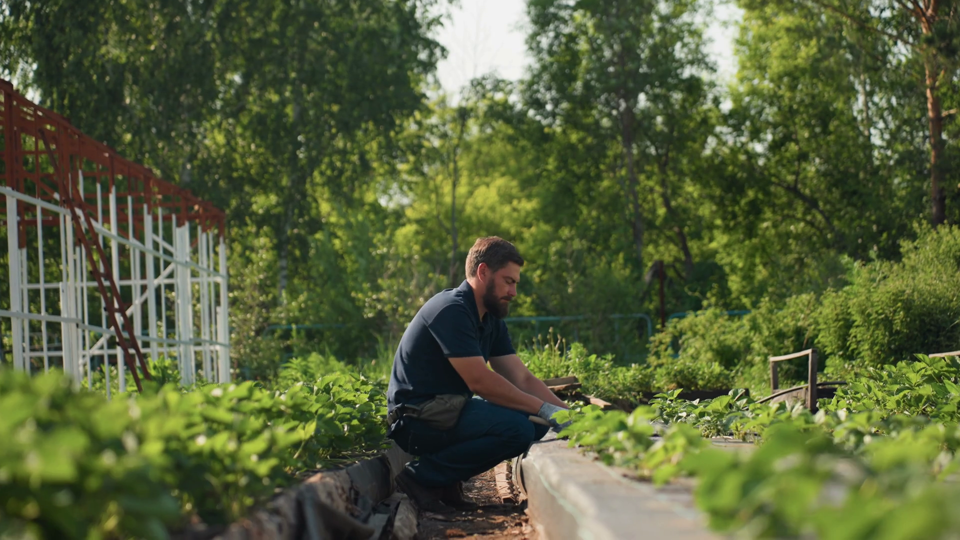 Side View Farmer Squatting In Garden Bed Works Soil Around Young Plants Gloved Hands Focused On Careful Tending Under Warm Sun RuralÂ