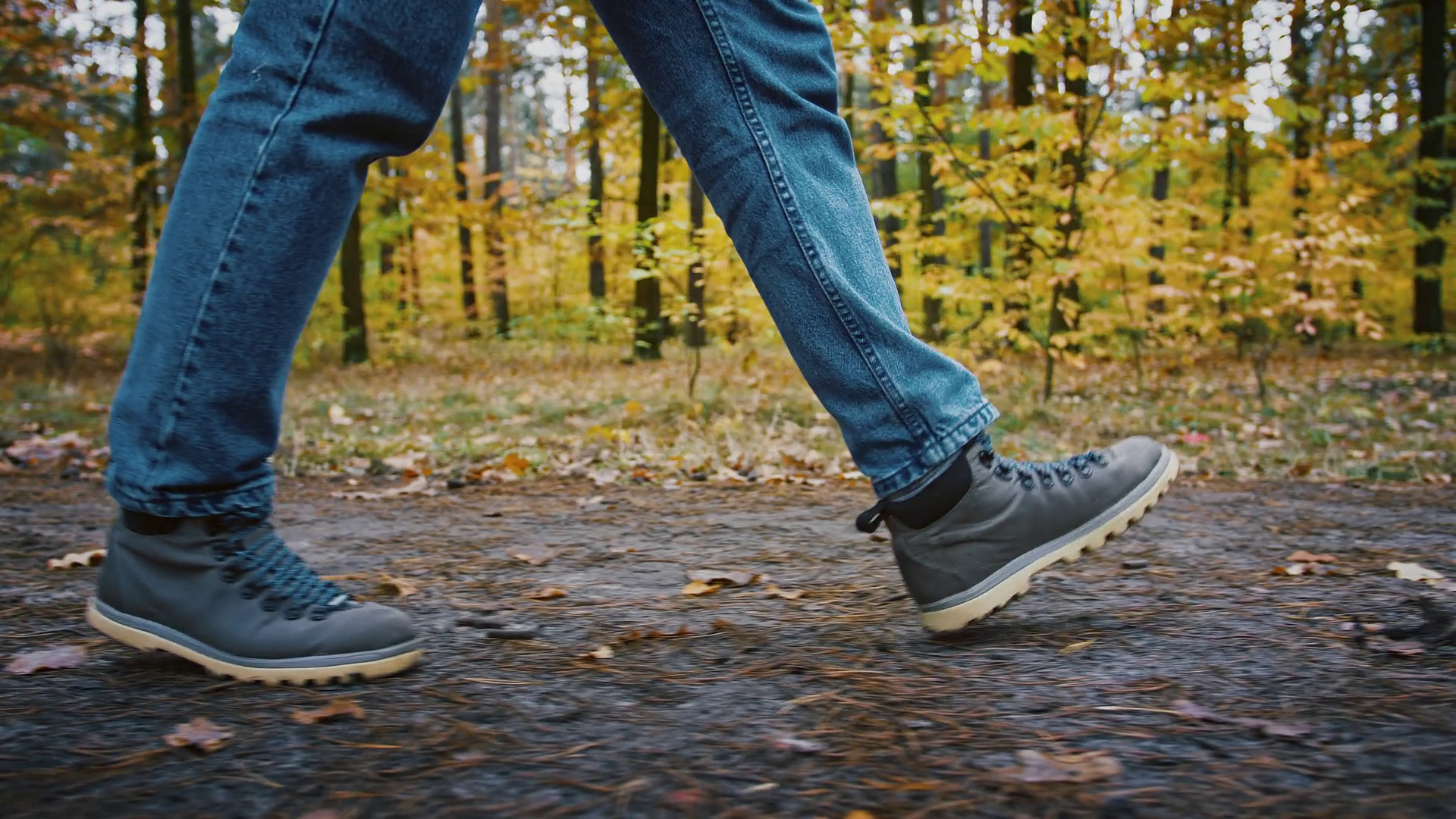Side View Of Male Legs Walking On Footpath At Autumn Forest Following ShotÂ