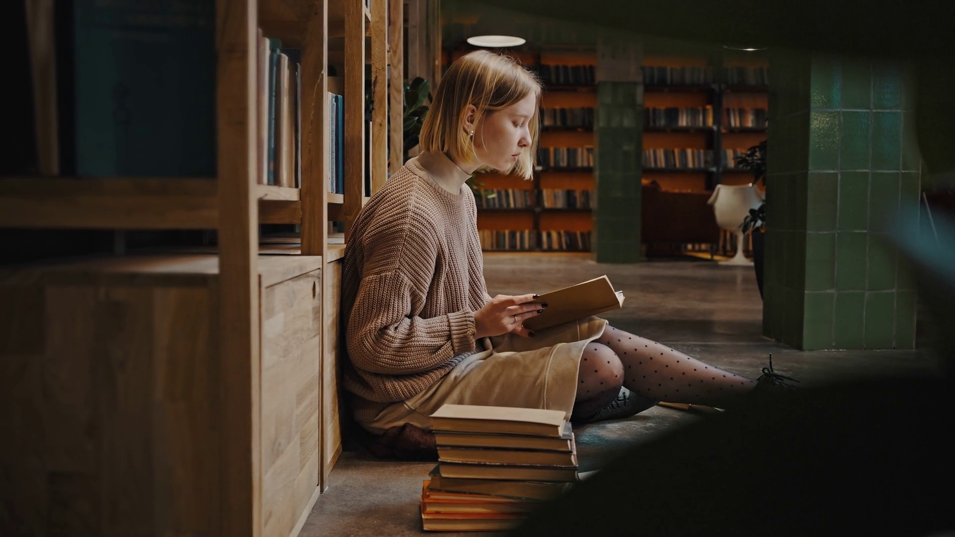 Young Student Focused On Reading Sitting By Bookshelf In LibraryÂ
