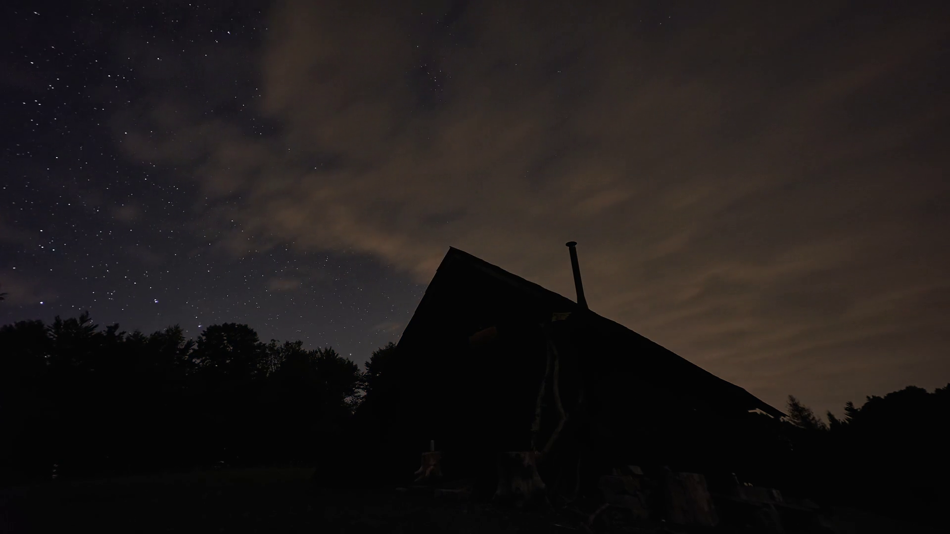 Silhouette Of A Wooden Cottage In The Forest Night Starry Sky With High CloudsÂ