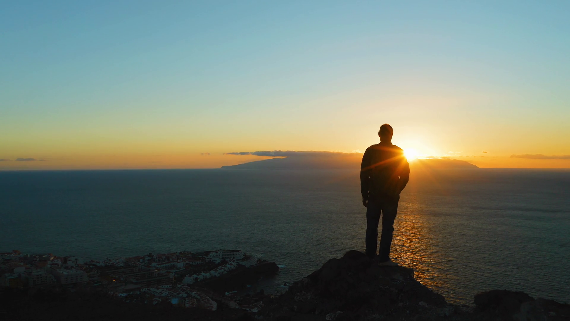 Silhouette Of Hiker Man Standing On Mountain Top At Sunset Boy Looking At Deep Ocean And Orange Dark Sky Adventure Freedom Exploration Of Planet EarthÂ