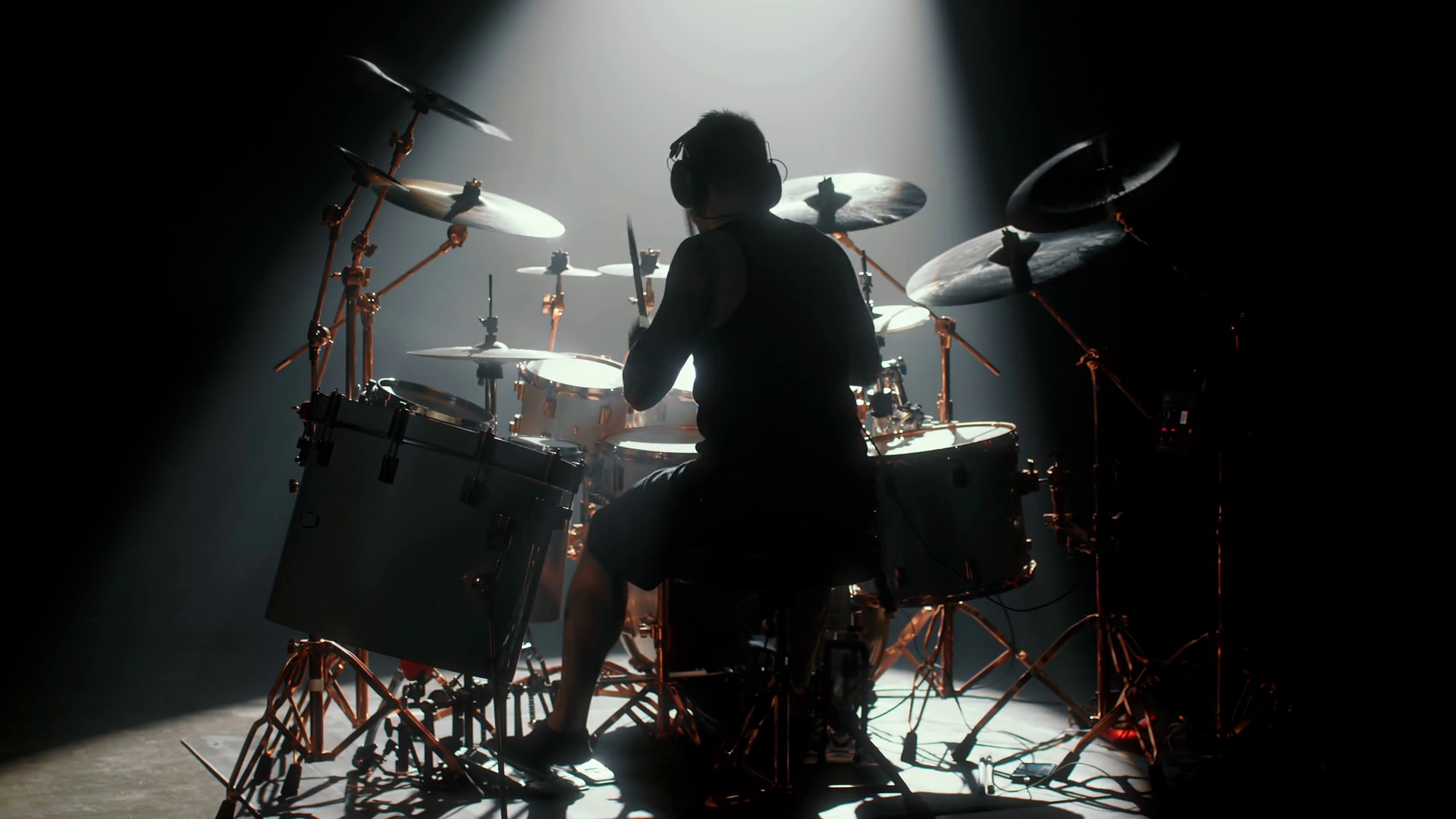 Silhouette Of Professional Drummer On Stage In Darkness Gig In Concert Hall Cinematic Backlit View Of Male Musician Punching Drum Set
