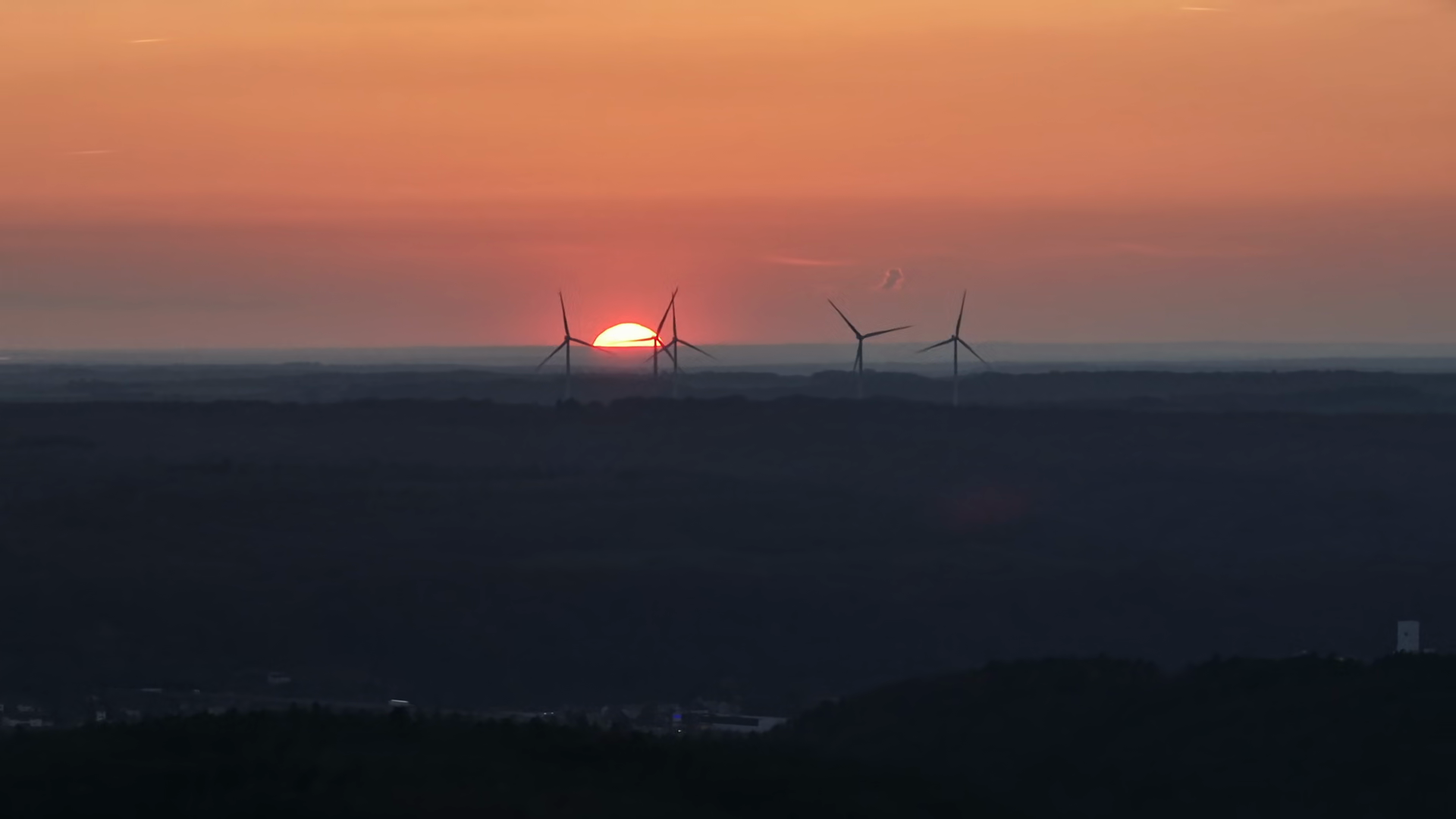 Silhouette Of Wind Turbines At Sunset In Alsace Lorraine Region With Bright Red Sun On The Horizon Under Dramatic Orange SkyÂ