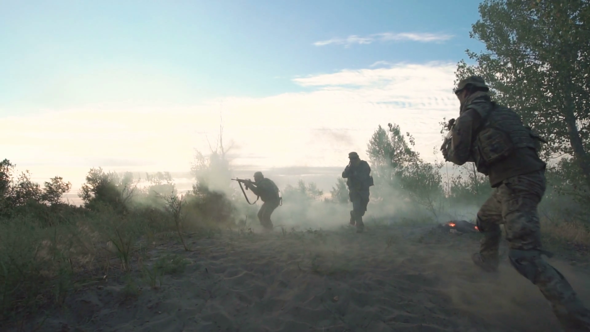 Silhouettes Of Soldiers Running On Battlefield And Aiming With Guns Through The Smoke And Looking AroundÂ
