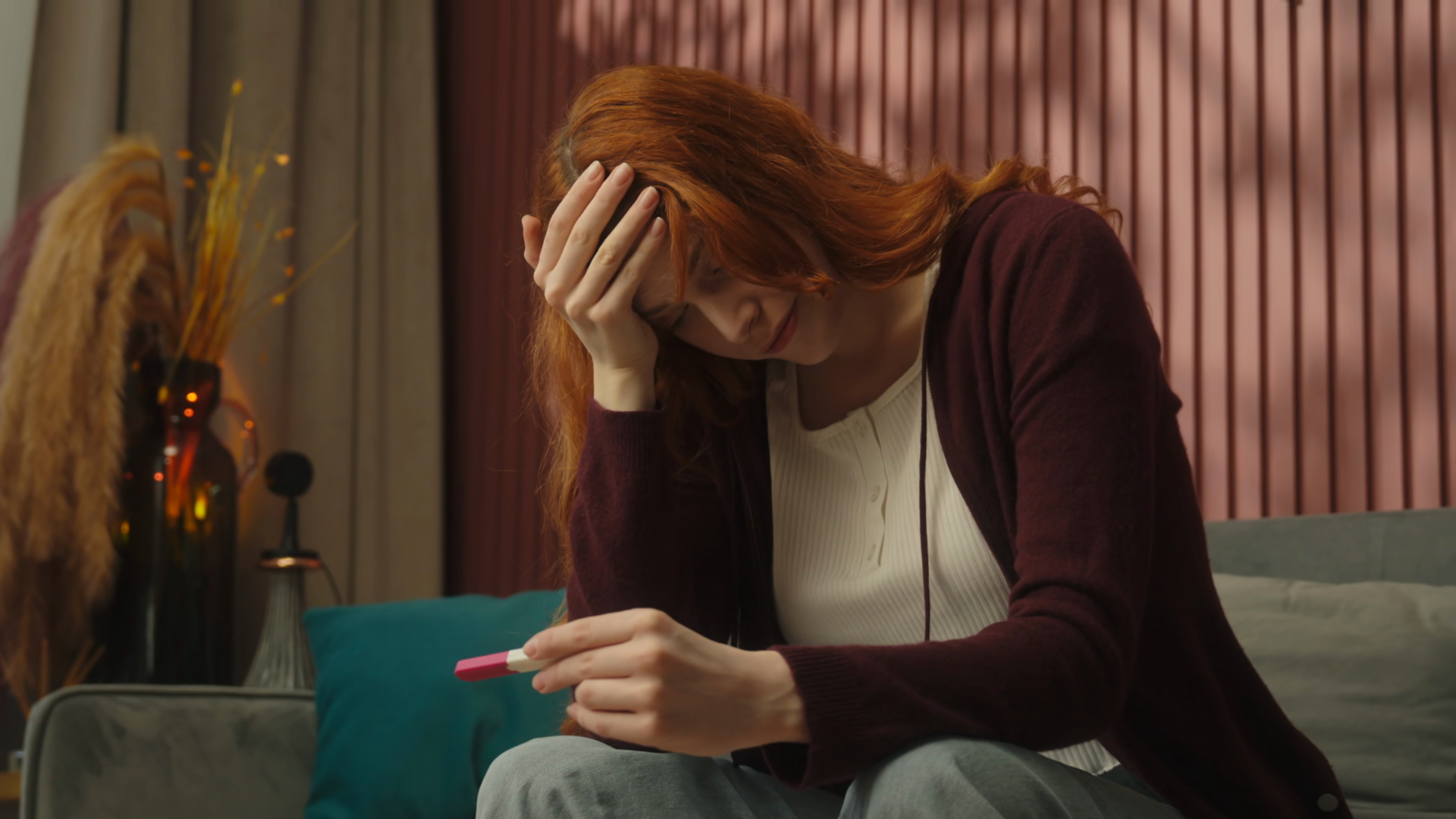 Single Pregnant Caucasian Woman Future Mother At Home Scared Stressed Sad Shocked Female Check Positive Or Negative Result Test UnwantedÂ