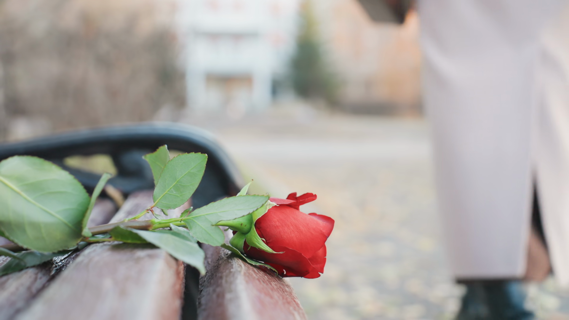 Single Rose And Note On Bench Hand Reaches To Leave Card From Secret Admirer Coat And Boots Visible Wet Wooden Slats With Autumn LeavesÂ