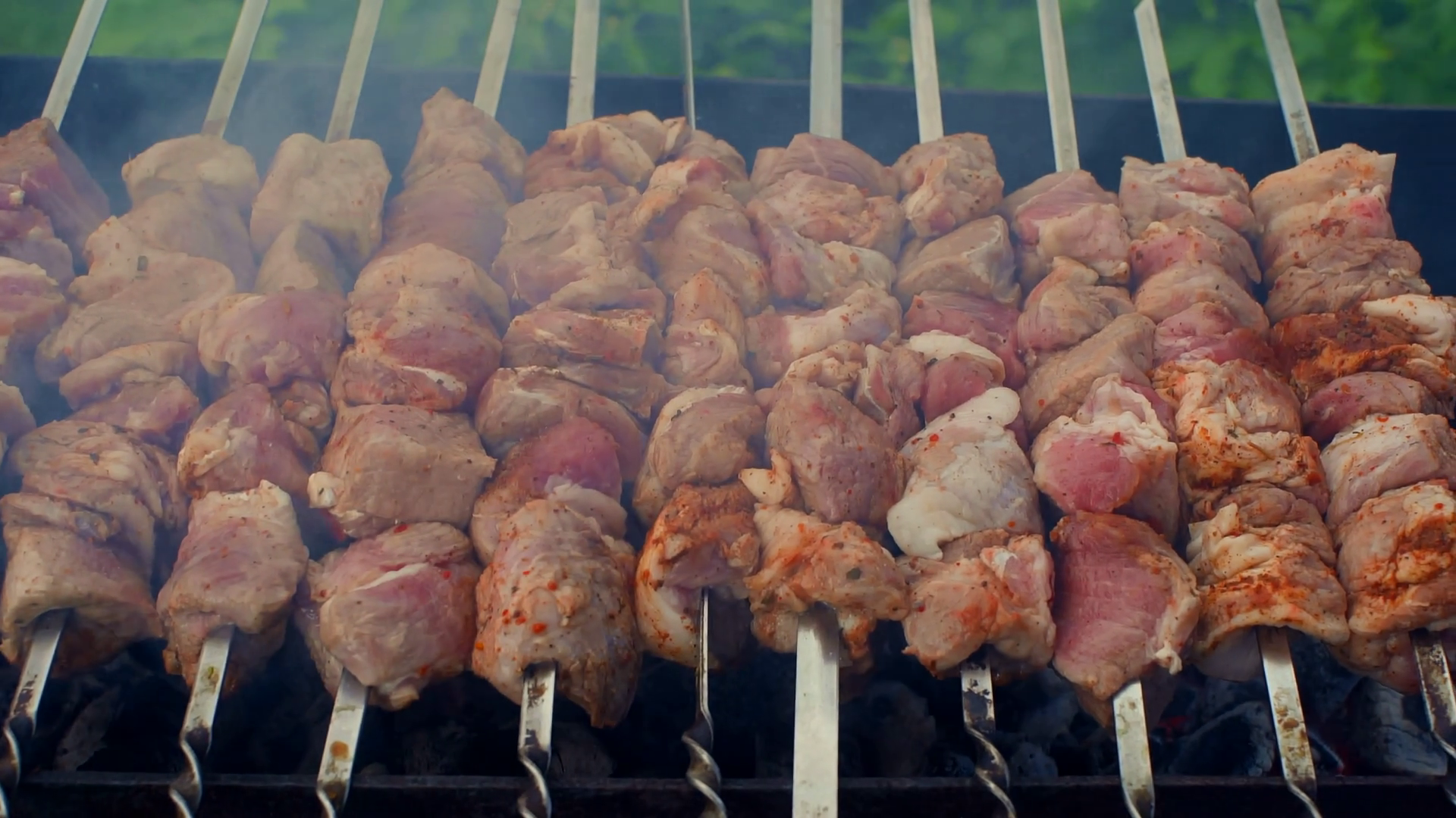 Sizzling Pork Skewers Grilling Over Hot Charcoal Creating Smoky Aroma While Juicy Meat Chunks Caramelize Under Dancing Flames In BackyardÂ