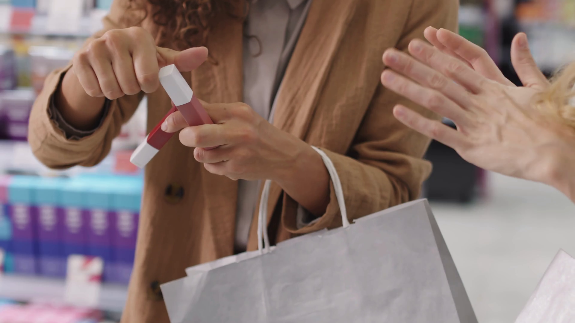 Slowmotion Midsection Footage Of Unrecognizable Women Choosing Matte Lipstick In Cosmetics Store Holding Testers Of Different ShadesÂ