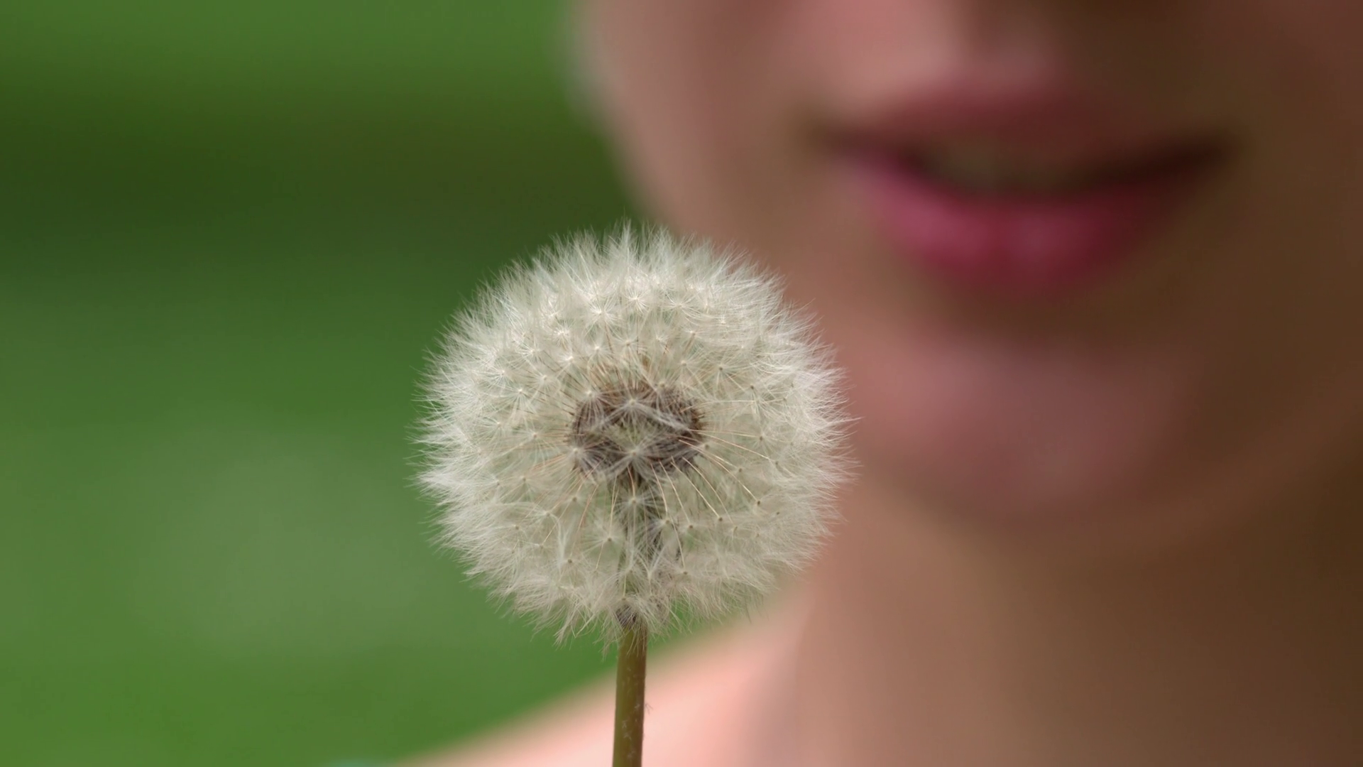 Slow Motion Of Dandelion Being Blown By A Person Filmed In 4k Dci Resolution 120 Fps Dandelion Seeds Are Being Blown On A Green Background Close UpÂ