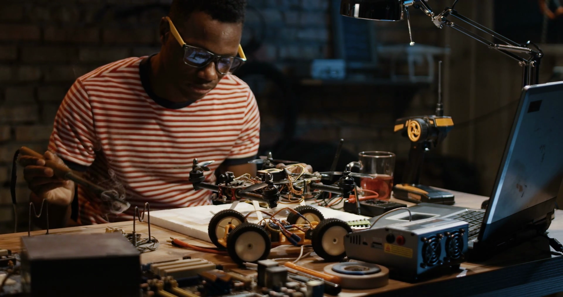 Slow Motion Shot Of A Black Man Repairing A Drone In A GarageÂ