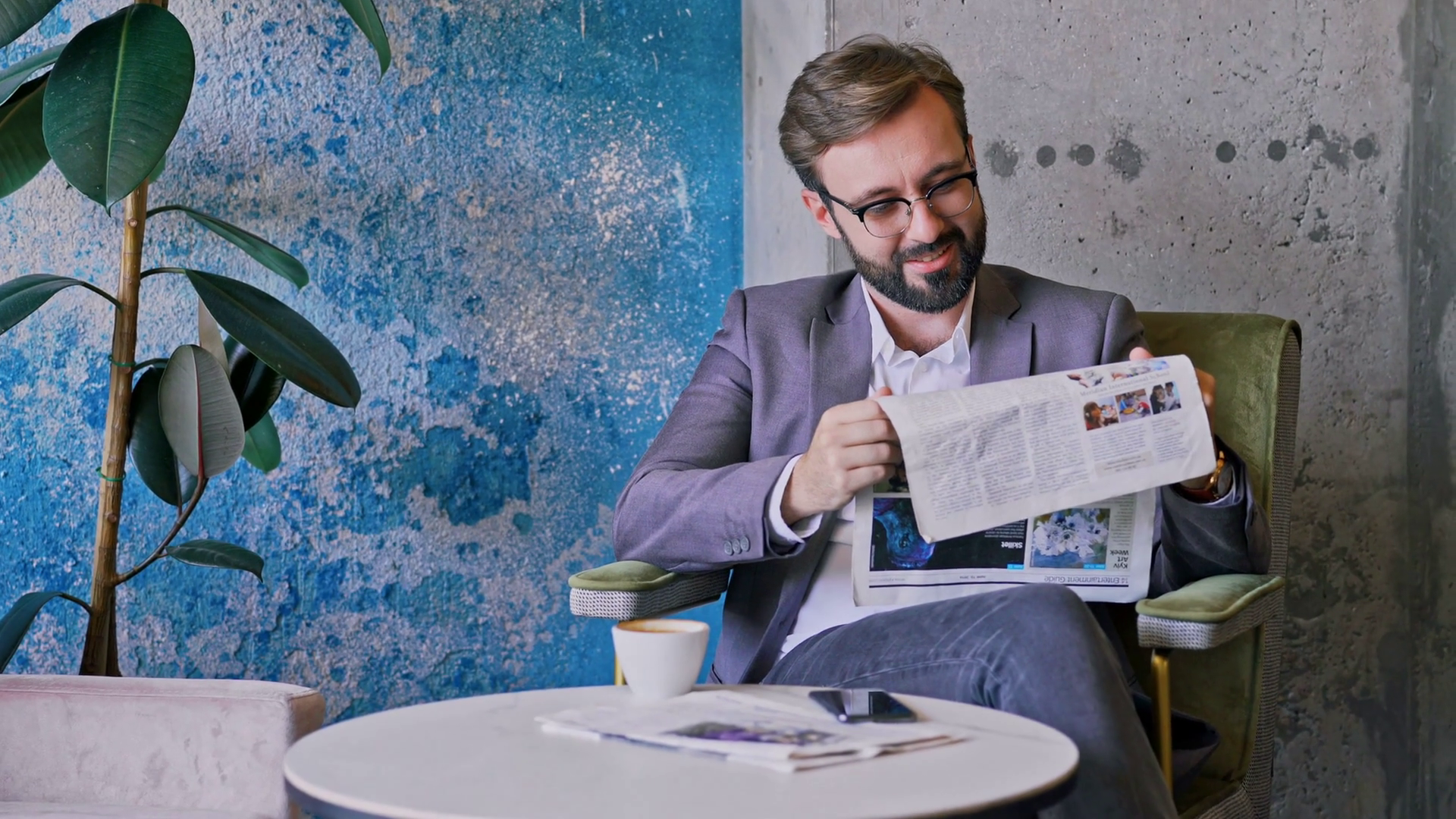 Smiling Bearded Business Man In Eyeglasses Reading Newspaper While Sitting By The Table At CafeÂ