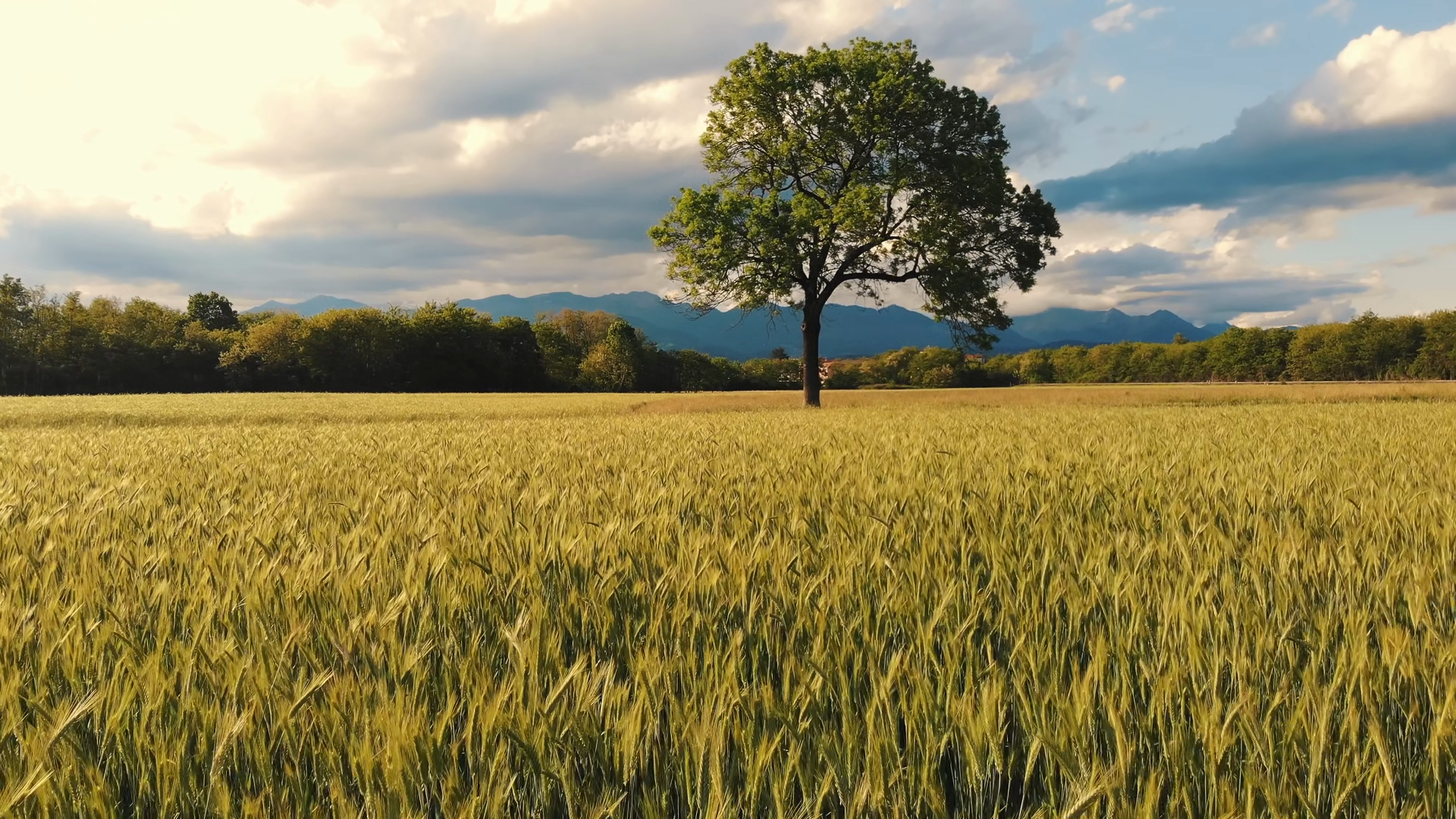 Solitary Tree Standing In A Vast Wheat Field With Distant Mountains In The Background On A Clear Summer Day Peaceful Rural Landscape For Agriculture And Nature ConceptsÂ