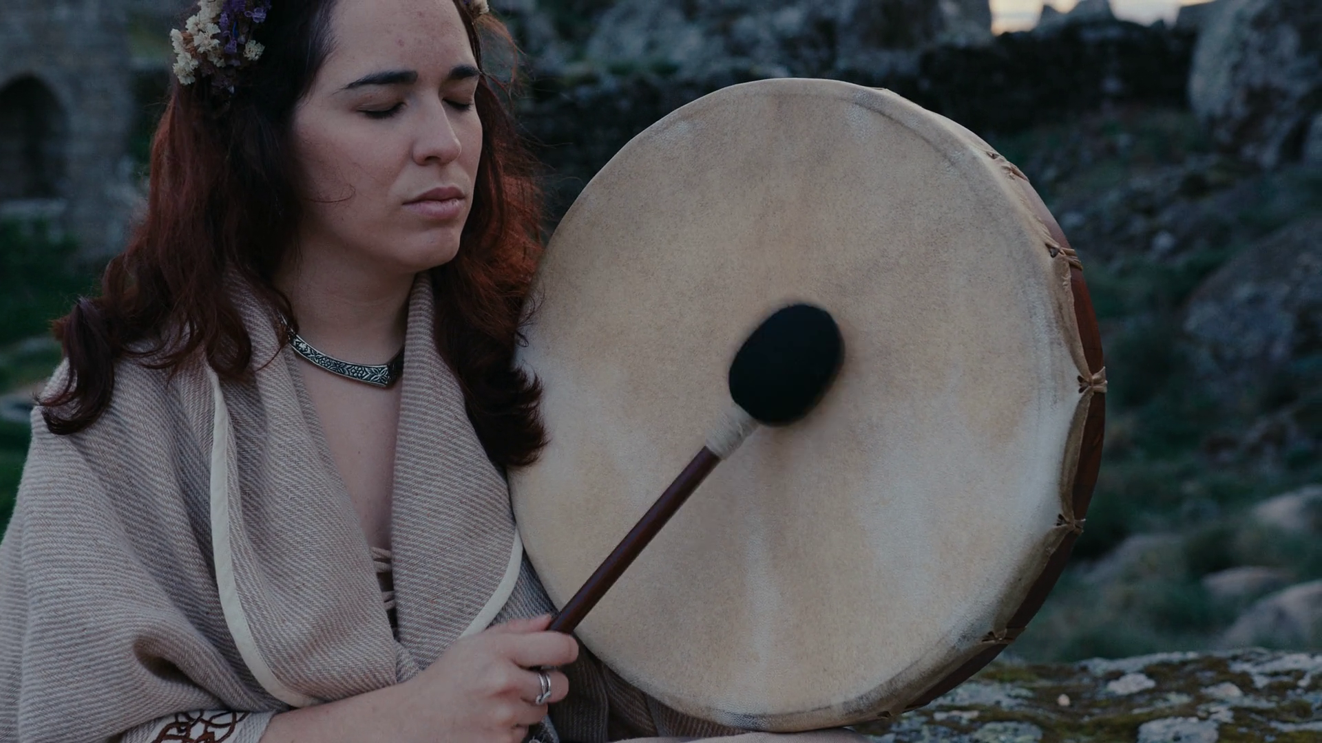 Spiritual Woman Peacefully Playing A Shamanic Drum In A Beautiful Medieval Village Close Detail ShotÂ