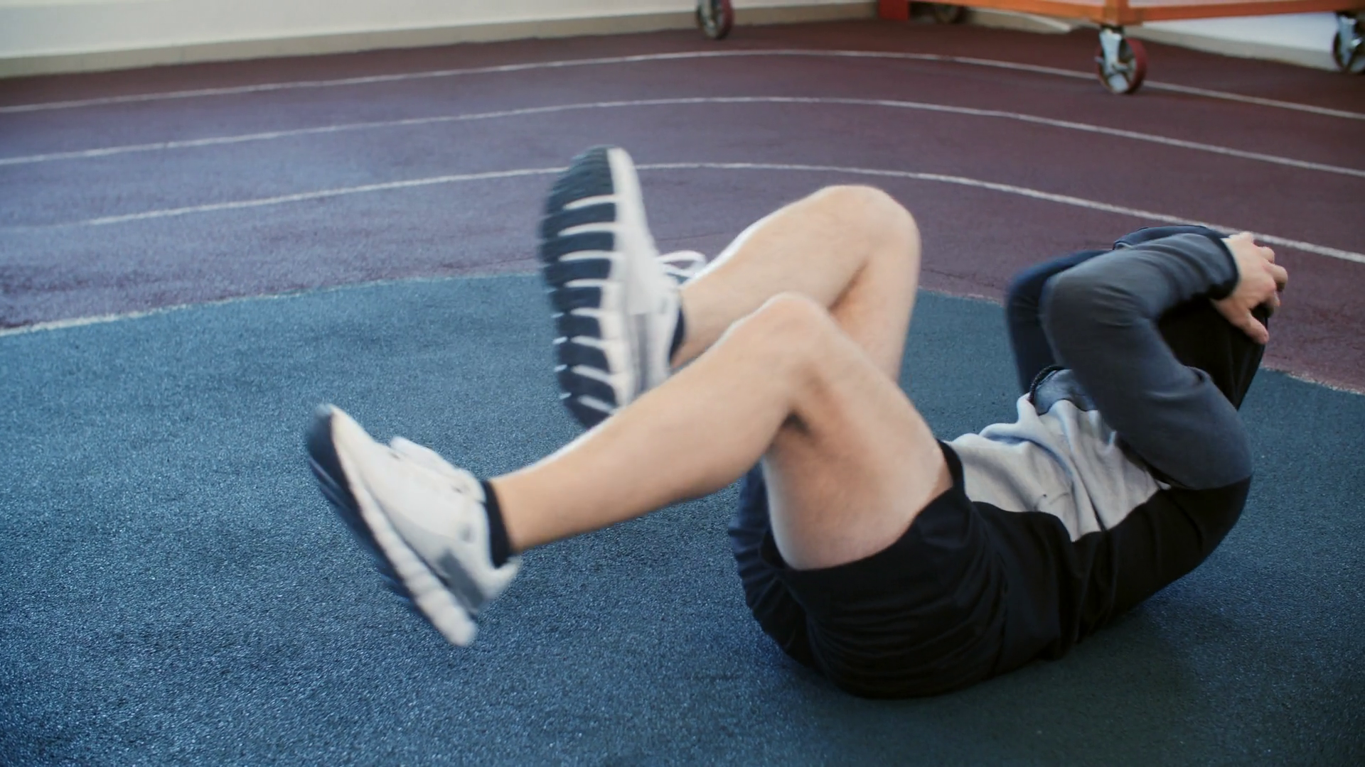 Sporty Man Doing Abs Abdominal Diagonal Crunches Training In Gym Lying On Floor Intensive Workout Of Caucasian Male Indoors Sport FitnessÂ