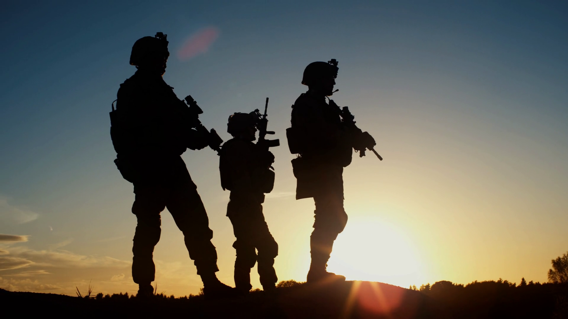 Squad Of Three Fully Equipped And Armed Soldiers Standing In Desert Environment In Sunset Light Slow MotionÂ