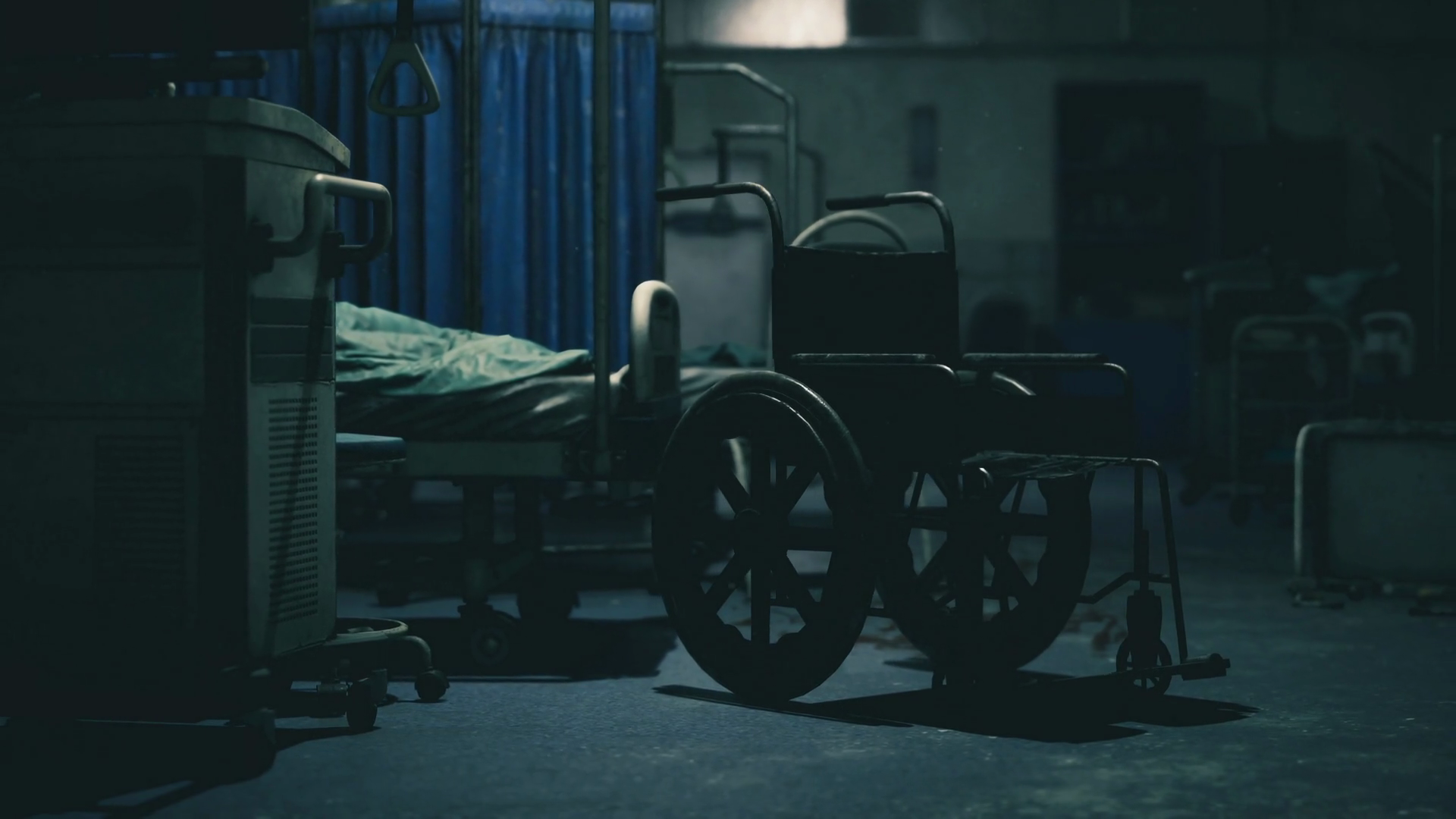 Still Hospital Scene Featuring Unoccupied Wheelchair And Tense Lighting Scene
