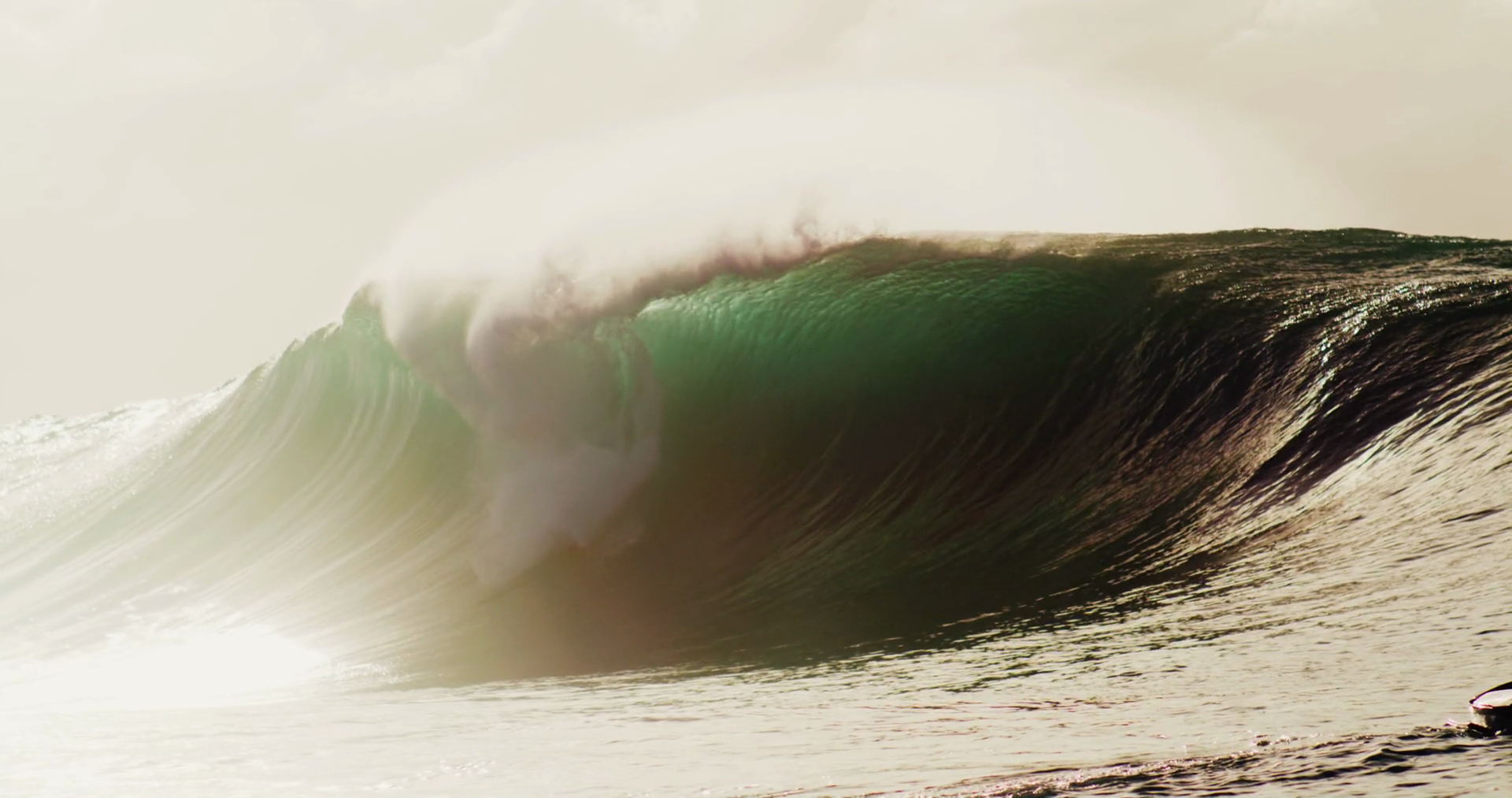 Surfers Drops In On Monster Huge Epic Wave Bottom Turning As Sun Flare GlistensÂ