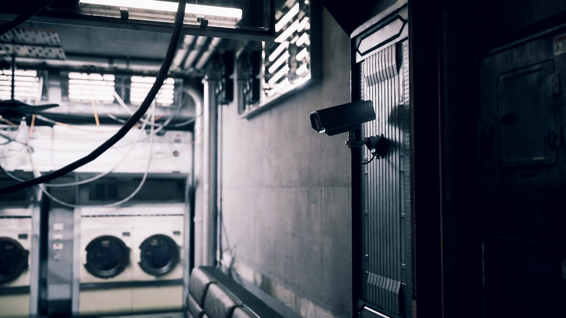 Surveillance Camera Watching Over A Dimly Lit Laundry Room With Machines
