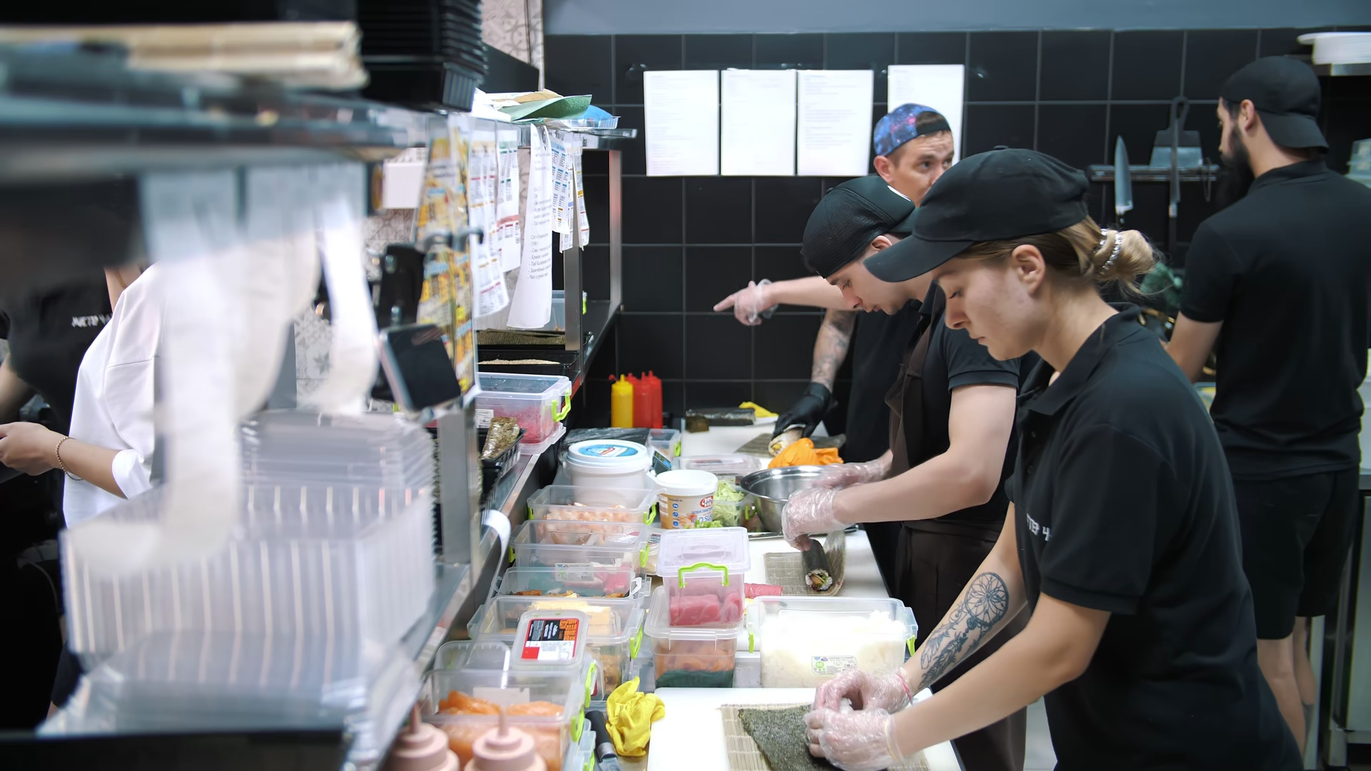 Team Of Chefs In Uniform Preparing Various Sushi Rolls Together In Professional Modern Restaurant Kitchen EnvironmentÂ