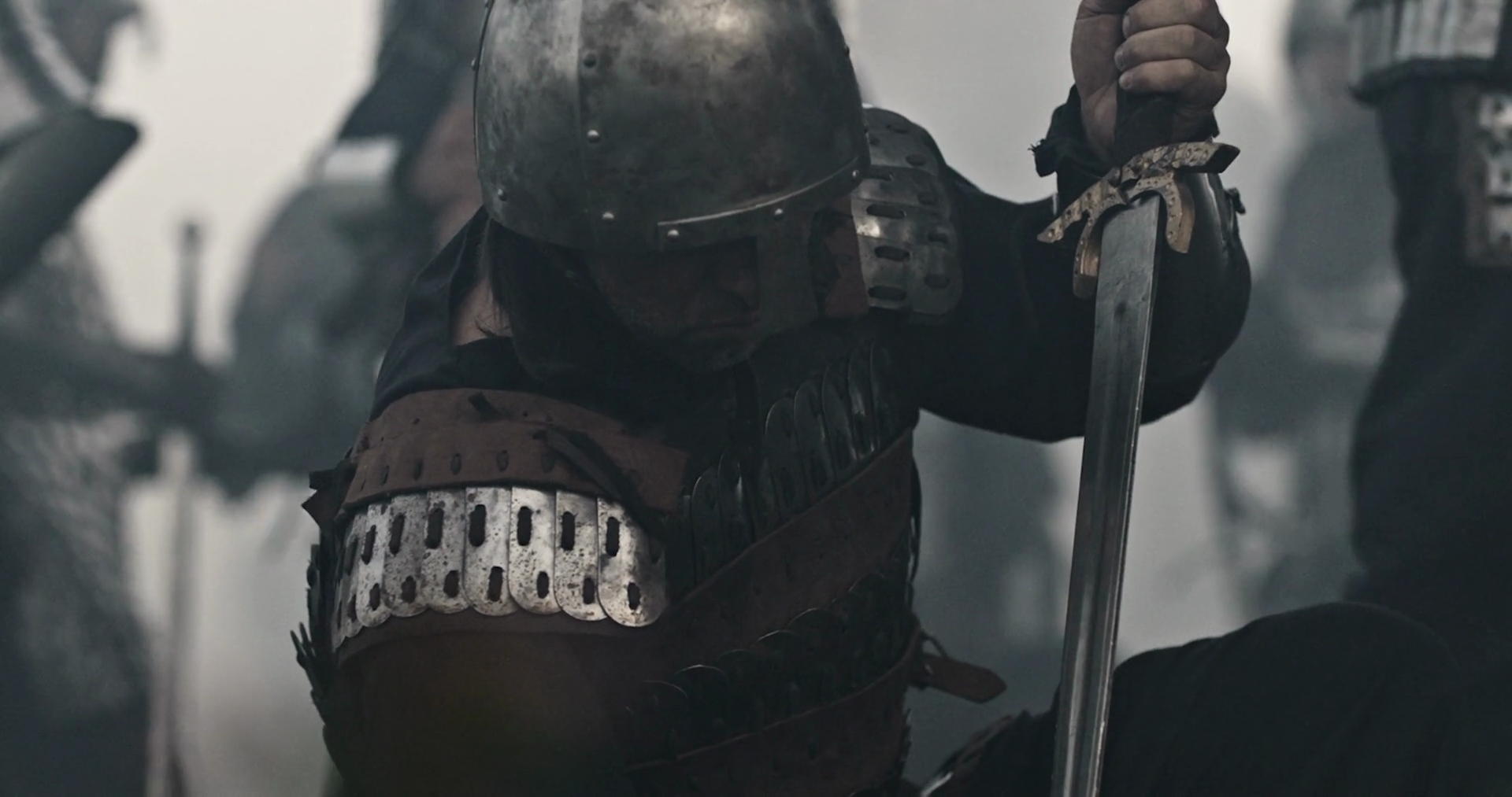 The Knight Sits Quietly Helmet On Carefully Wiping His Sword His Armored Hands Move Steadily Over The Blade Removing Dirt And Blood From The Battle His Focus Is Calm Yet His Eyes Show Deep ContemplationÂ