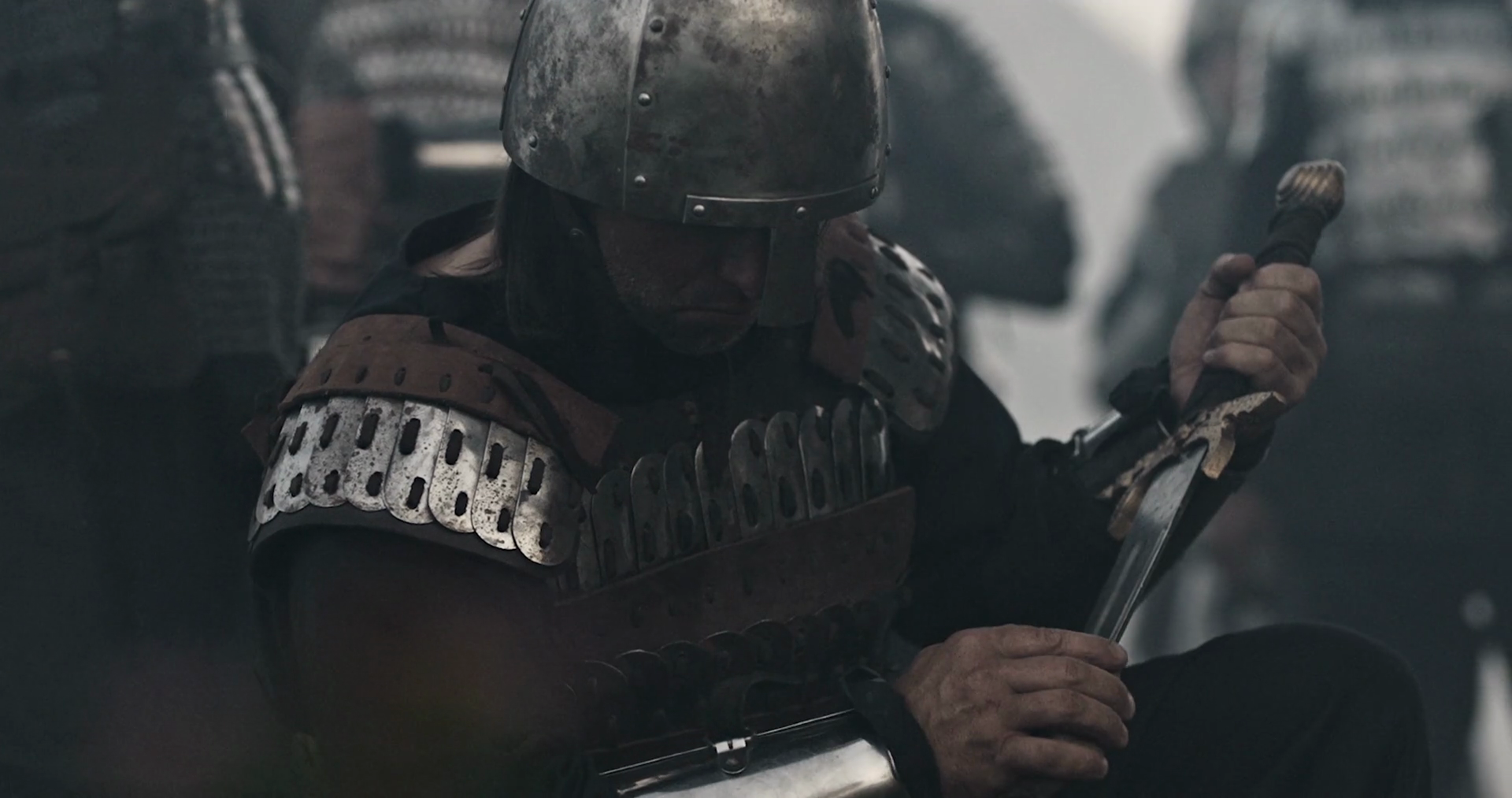 The Knight Sits Quietly Helmet On Carefully Wiping His Sword His Armored Hands Move Steadily Over The Blade Removing Dirt And Blood From The Battle His Focus Is Calm Yet His Eyes Show Deep ContemplationÂ