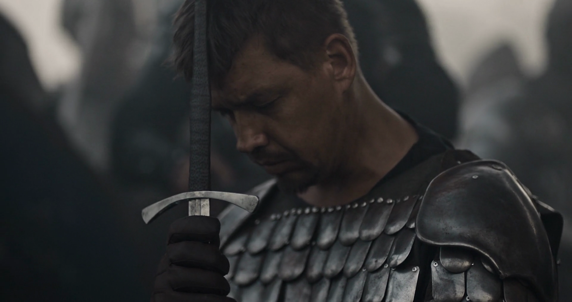 The Knight Stands Tall His Hands Clasped Around The Hilt Of His Sword Which Rests Tipdown In The Ground His Head Is Bowed In Reverence As He Prays To Jesus Seeking Strength And Guidance For The Battles AheadÂ