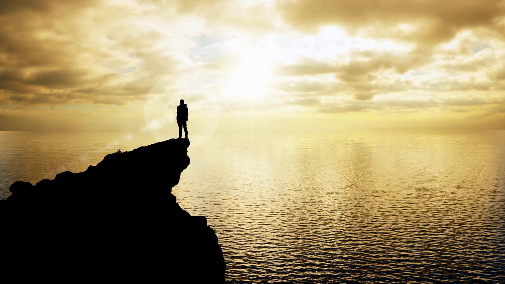 The Silhouette Of A Man Standing On A Cliff Edge Absorbing The Healing Energy Of The Sun While Witnessing The Breathtaking Views Of NatureÂ