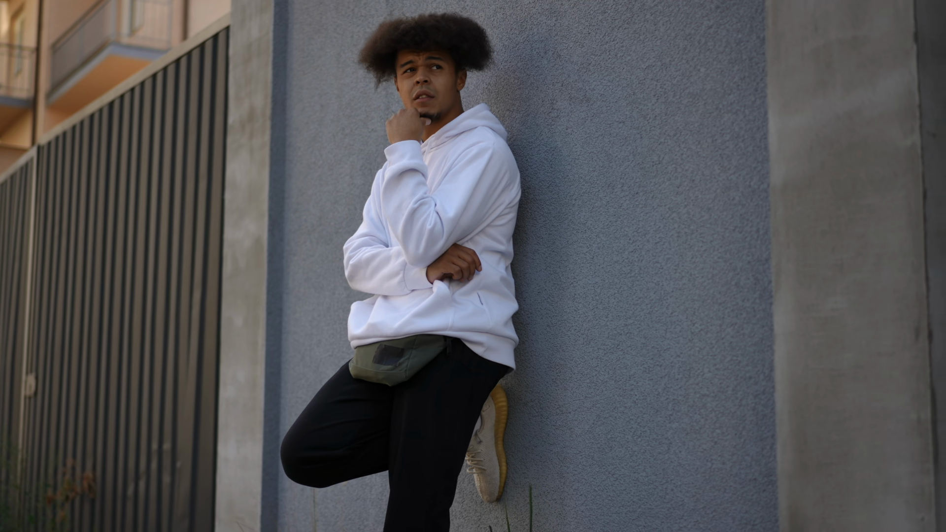 Thoughtful Mixedrace Man With An Afro Hairstyle Wearing Casual Clothes Leans Against A Gray Wall Stroking His Chin In ContemplationÂ
