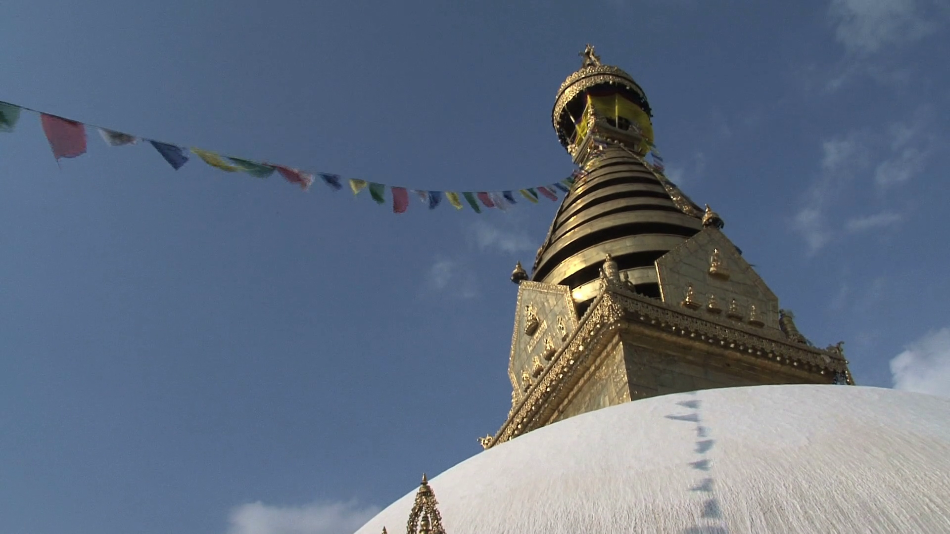 Tilt From The Prayer Wheel To The Swayambhunath Stupa Monkey Temple With Prayer Flags In The Wind With A Shadow On The StupaÂ