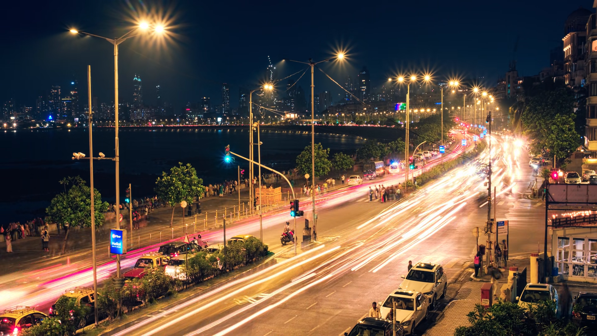 Timelapse Of Marine Drive In The Night With Car Light Trails Mumbai Maharashtra IndiaÂ