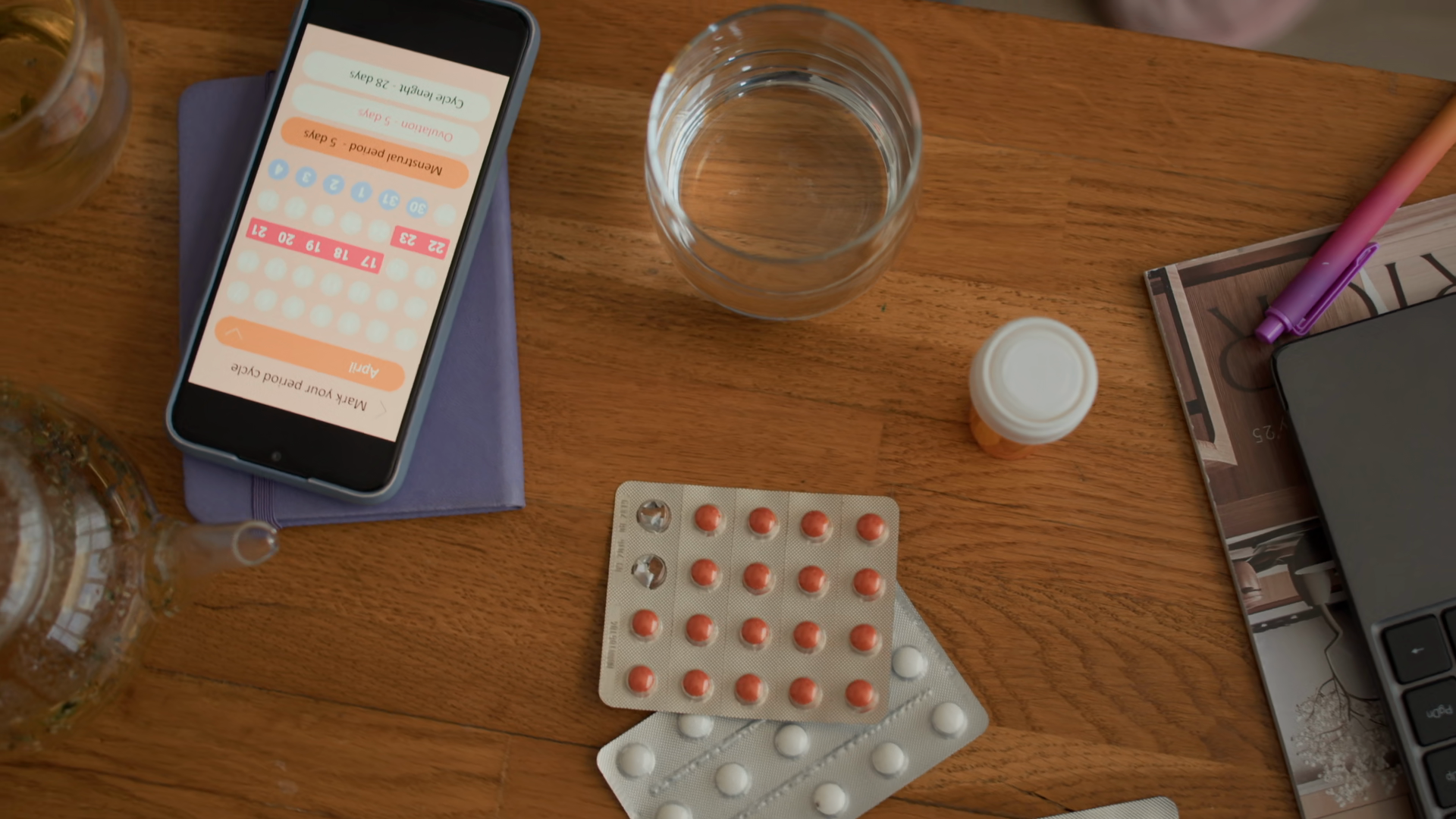 Top Down Shot Of Hand Of Unrecognizable Black Woman Taking Smartphone With Application For Menstrual Cycle Tracking From Wooden Table With Pills And CupsÂ