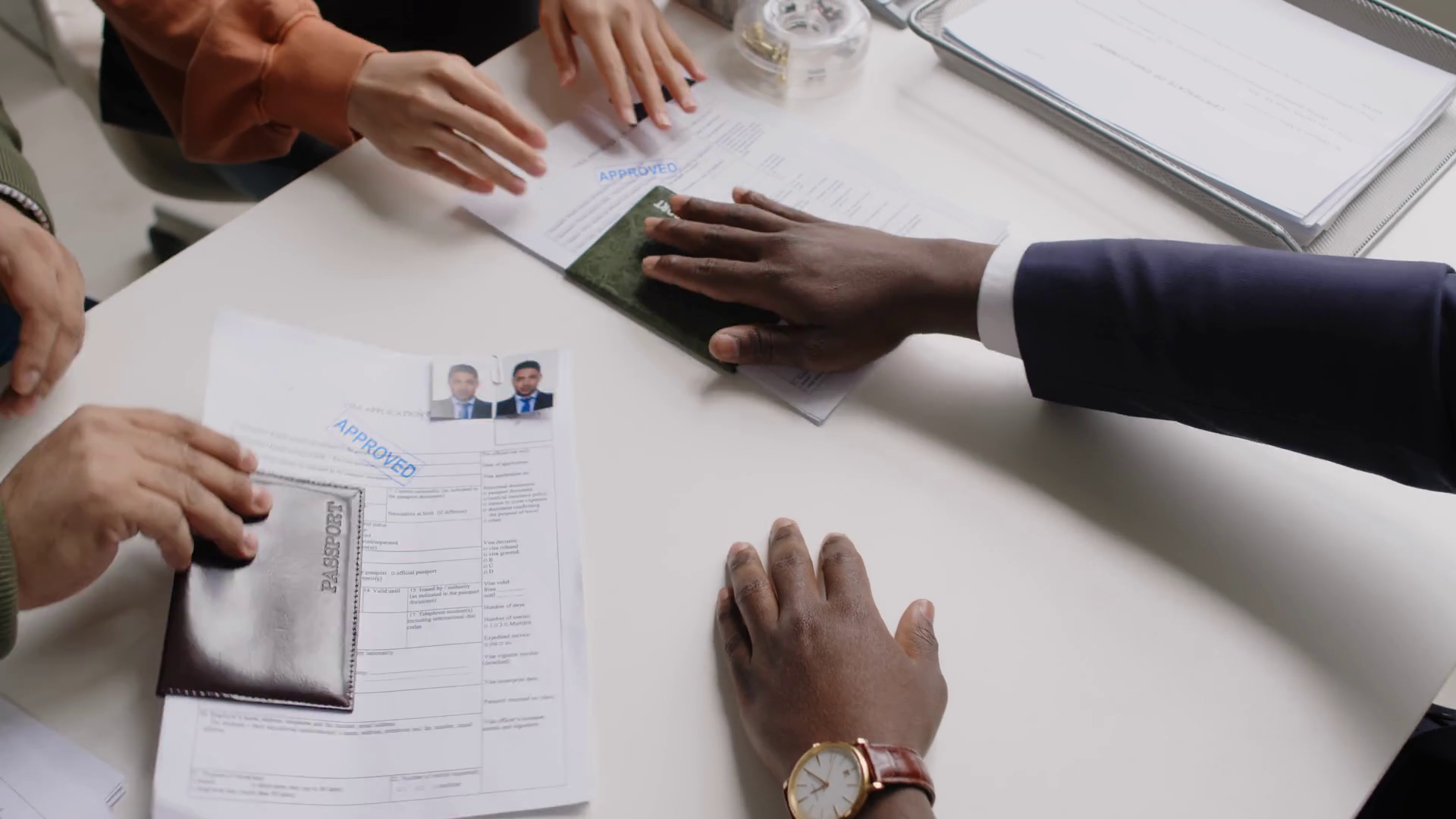 Top View Of Anonymous Black Male Visa Officer Approving Visas For Married Couple And Giving Them Documents Back During Interview In ConsulateÂ