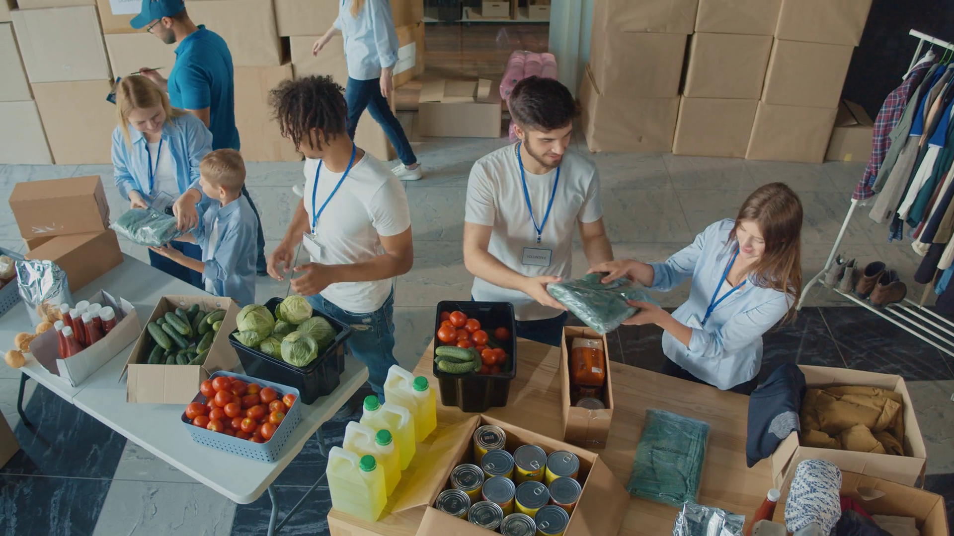 Top View The Concept Of Social Aid Cute Young Boy Help To Volunteers To Sorting Humanitarian Aid At Distribution Or Refugee CenterÂ