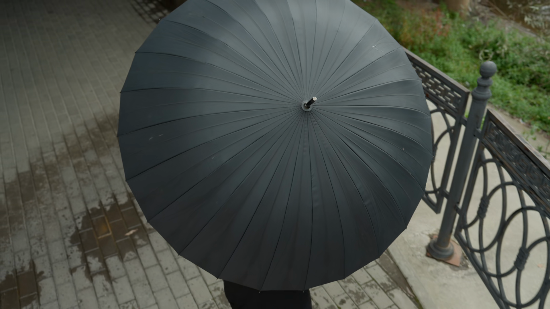 Topdown Black Umbrella Over Pavement Iron Railing And Puddles Visible Subtle Raindrops On Textured Canopy Radial Pattern And Knob DetailÂ