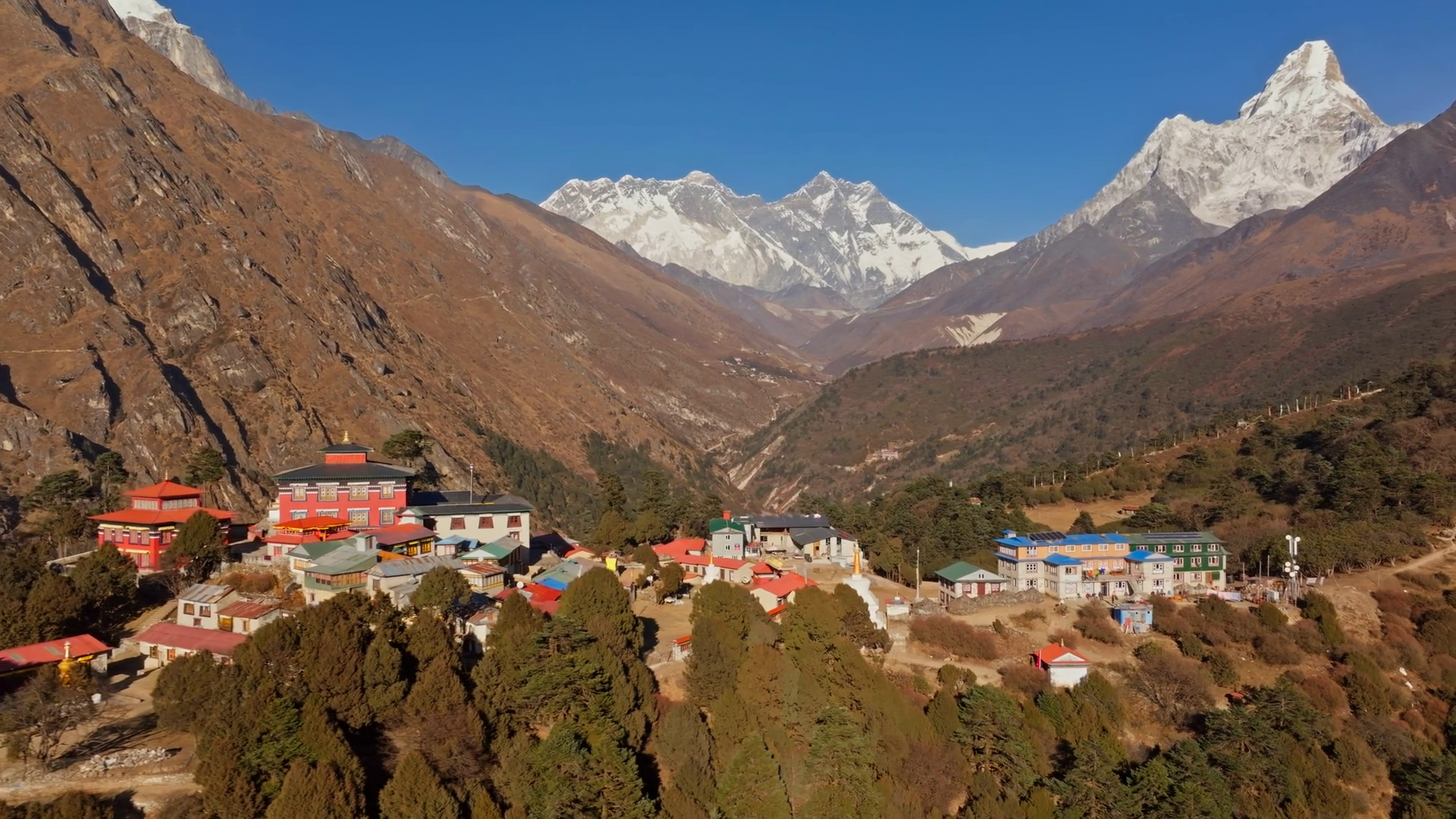 Towering Mount Everest Looming Behind Tengboche Monastery Highlighting Spiritual Sanctuary Nestled Within Dramatic Nepalese HimalayanÂ